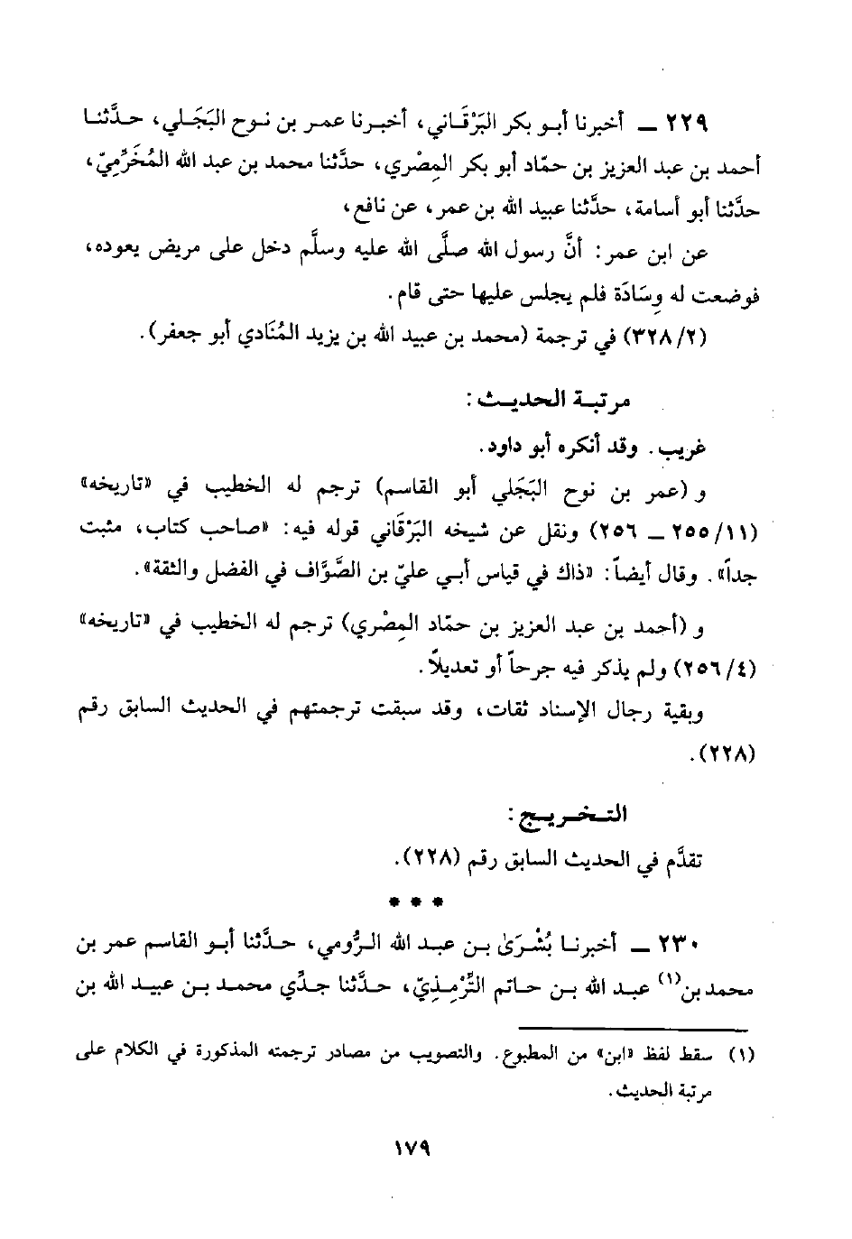 ٢٢٩ - أخبرنا أبو بكر البَرْقَاني، أخبرنا عمر بن نوح البَجَلي، حدَّثنا أحمد بن عبد العزيز بن حمّاد أبو بكر المِصْري، حدَّثنا محمد بن عبد اللَّه المُخَرِّمِيّ، حدَّثنا أبو أسامة، حدَّثنا عبيد اللَّه بن عمر، عن نافع،