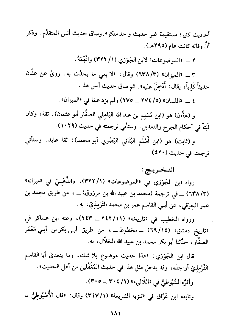 ٣ - "الميزان" (٣/ ٦٣٨) وقال: "لا يعي ما يحدِّث به. روى عن عفّان حديثًا كَذِبًا، يقال: أُدْخِلَ عليه". ثم ساق حديث أنس هذا.