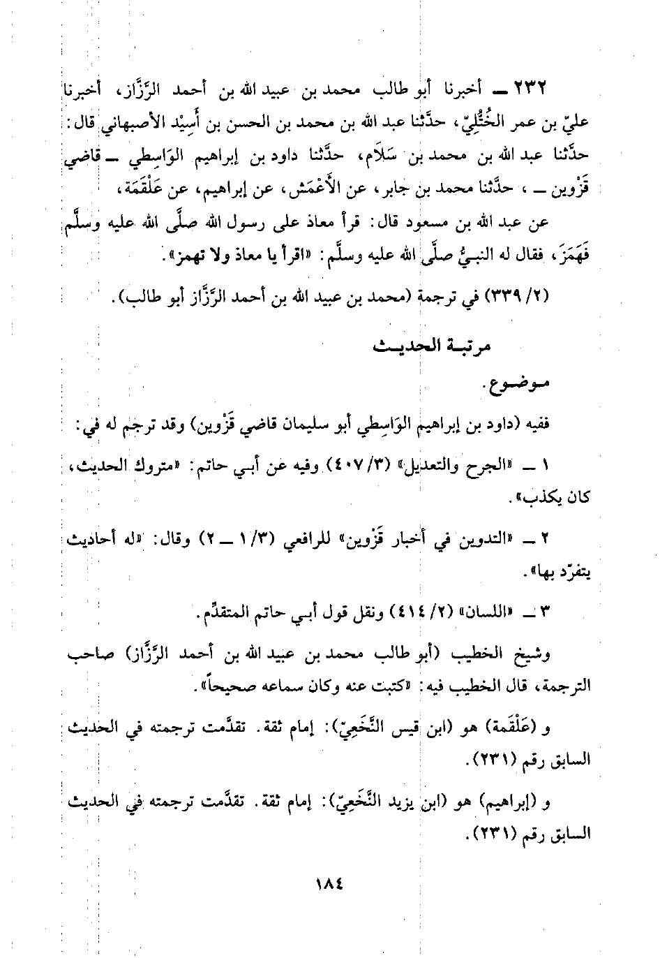 ٢٣٢ - أخبرنا أبو طالب محمد بن عبيد اللَّه بن أحمد الرَّزَّاز، أخبرنا عليّ بن عمر الخُتُّلِيّ، حدَّثنا عبد اللَّه بن محمد بن الحسن بن أَسِيْد الأصبهاني قال: حدَّثنا عبد اللَّه بن محمد بن سَلَام، حدَّثنا داود بن إبراهيم الوَاسِطي -قاضي قَزْوين-، حدَّثنا محمد بن جابر، عن الأَعْمَش، عن إبراهيم، عن عَلْقَمَة،