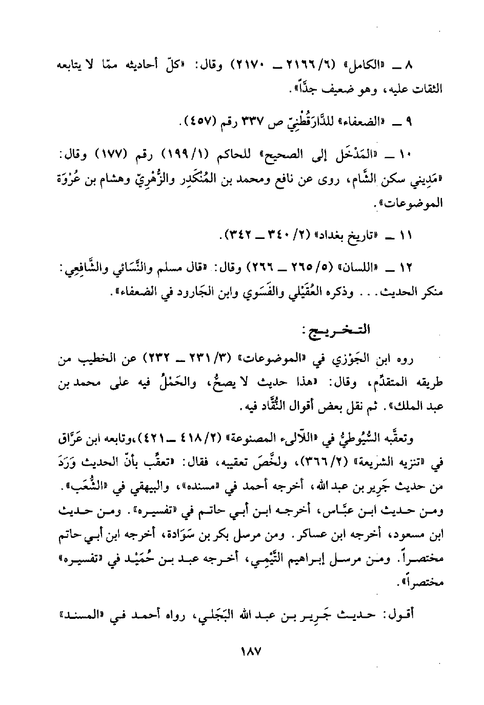 ١٢ - "اللسان" (٥/ ٢٦٥ - ٢٦٦) وقال: "قال مسلم والنَّسَائي والشَّافِعِي: منكر الحديث. . . وذكره العُقَيْلي والفَسْوي وابن الجَارود في الضعفاء".
