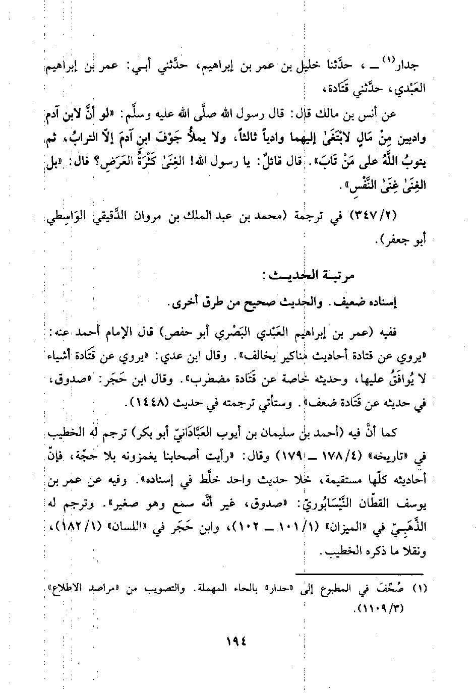 ففيه (عمر بن إبراهيم العَبْدي البَصْري أبو حفص) قال الإِمام أحمد عنه: "يروي عن قتادة أحاديث مناكير يخالف". وقال ابن عدي: ويروي عن قَتَادة أشياء لا يُوافَقُ عليها، وحديثه خاصة عن قَتَادة مضطرب". وقال ابن حَجَر: "صدوق، في حديثه عن قَتَادة ضعف". وستأتي ترجمته في حديث (١٤٤٨).