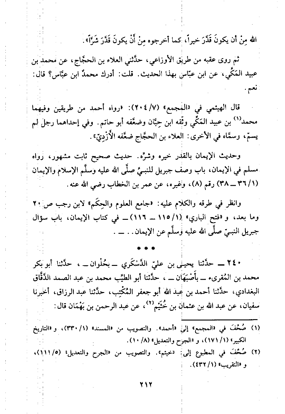 ٢٤٠ - حدَّثنا يحيى بن عليّ الدَّسْكَري -بحُلْوان-، حدَّثنا أبو بكر محمد بن المُقرئ -بأَصْبَهَان-، حدَّثنا أبو الطيِّب محمد بن عبد الصمد الدَّقَّاق البغدادي، حدَّثنا أحمد بن عبد اللَّه أبو جعفر المُكْتِب، حدَّثنا عبد الرزاق، أخبرنا سفيان، عن عبد اللَّه بن عثمان بن خُثَيْم (¬٢)، عن عبد الرحمن بن بَهْمَان قال: