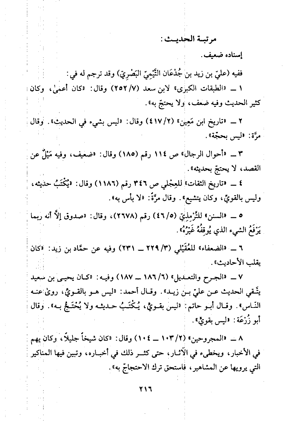 ٧ - "الجرح والتعديل" (٦/ ١٨٦ - ١٨٧) وفيه: "كان يحيى بن سعيد يتَّقي الحديث عن عليّ بن زيد". وقال أحمد: "ليس هو بالقويِّ، روى عنه النَّاس". وقال أبو حاتم: "ليس بقويٍّ، يُكْتَبُ حديثه ولا يُحْتَجُّ به". وقال: أبو زُرْعَة: "ليس بقويٍّ".