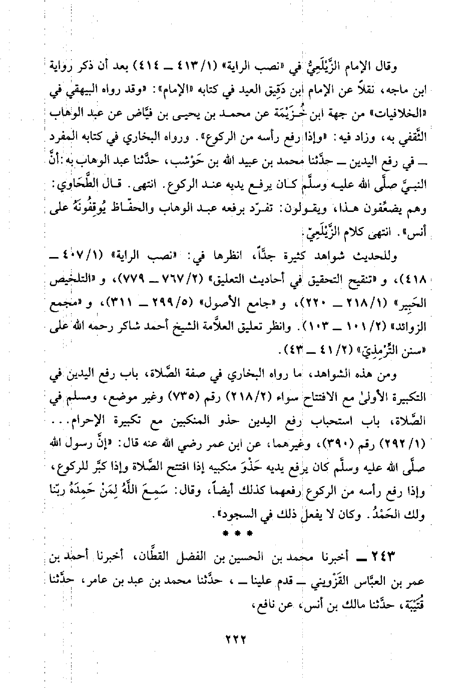 وقال الإِمام الزَّيْلَعِيُّ في "نصب الراية" (١/ ٤١٣ - ٤١٤) بعد أن ذكر رواية ابن ماجه، نقلًا عن الإِمام ابن دَقِيق العيد في كتابه "الإِمام": "وقد رواه البيهقي في "الخلافيات" من جهة ابن خُزَيْمَة عن محمد بن يحيى بن فيَّاض عن عبد الوهاب الثَّقفي به، وزاد فيه: "وإذا رفع رأسه من الركوع". ورواه البخاري في كتابه المفرد -في رفع اليدين- حدَّثنا محمد بن عبيد اللَّه بن حَوْشب، حدَّثنا عبد الوهاب به: أنَّ النبيَّ صلَّى اللَّه عليه وسلَّم كان يرفع يديه عند الركوع. انتهى. قال الطَّحَاوي: وهم يضعِّفون هذا، ويقولون: تفرَّد برفعه عبد الوهاب والحفَّاظ يُوقِفُونَهُ على أنس". انتهى كلام الزَّيْلَعِيّ.
