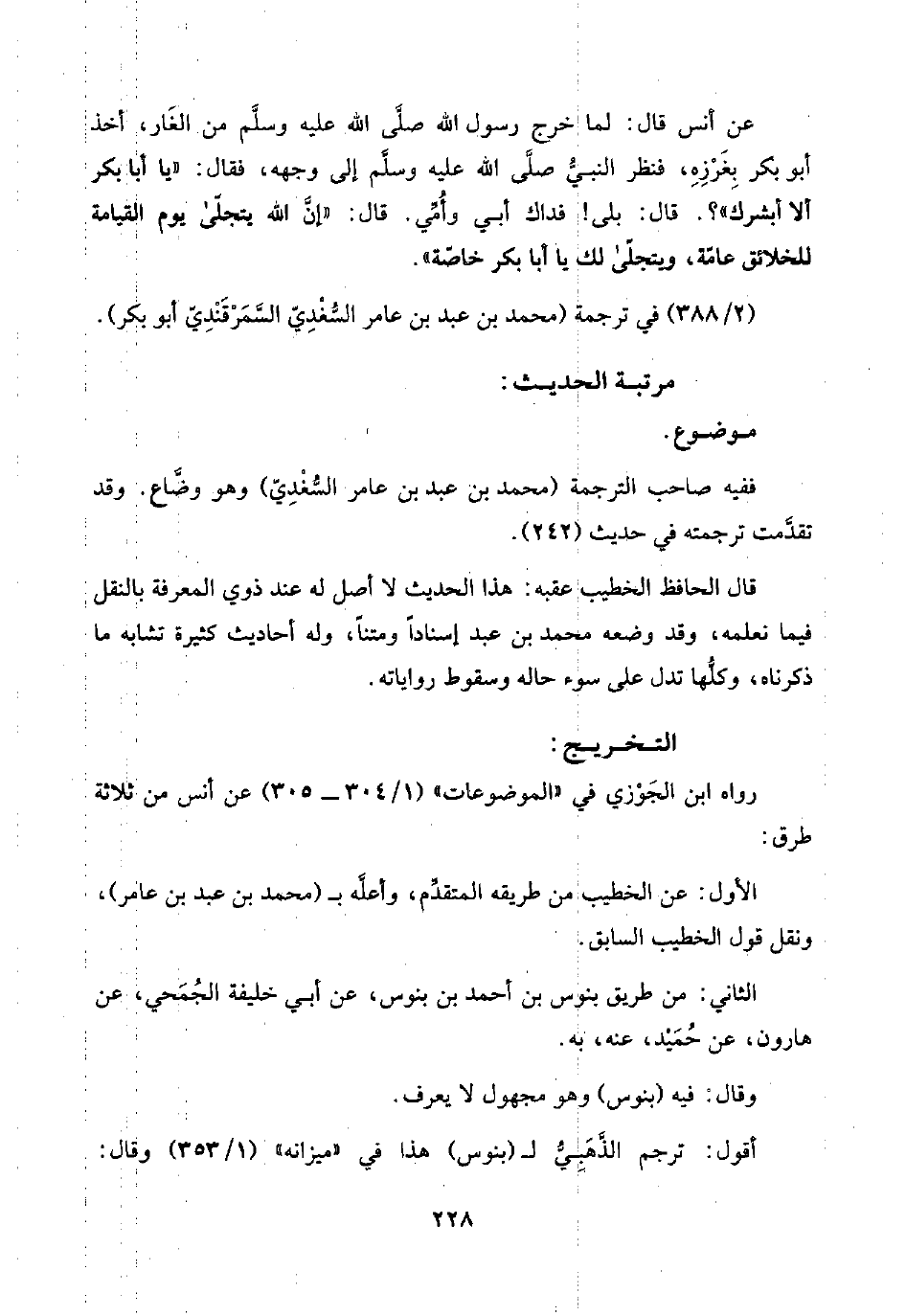 قال الحافظ الخطيب عقبه: هذا الحديث لا أصل له عند ذوي المعرفة بالنقل فيما نعلمه، وقد وضعه محمد بن عبد إسنادًا ومتنًا، وله أحاديث كثيرة تشابه ما ذكرناه، وكلُّها تدل على سوء حاله وسقوط رواياته.