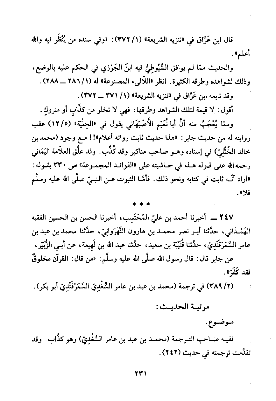 ٢٤٧ - أخبرنا أحمد بن عليّ المُحْتَسِب، أخبرنا الحسن بن الحسين الفقيه الهَمْدَاني، حدَّثنا أبو نصر محمد بن هارون النَّهْرَوانِيّ، حدَّثنا محمد بن عبد بن عامر السَّمَرْقَنْدِيّ، حدَّثنا قُتَيْبَة بن سعيد، حدَّثنا عبد اللَّه بن لَهِيعَة، عن أبي الزُّبَيْر، عن جابر قال: قال رسول اللَّه صلَّى اللَّه عليه وسلَّم: "من قال: القرآن مخلوقٌ فقد كَفَرَ".