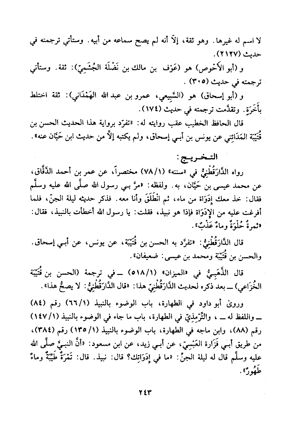 قال الدَّارَقُطْنِيُّ: "تفرَّد به الحسن بن قُتَيْبَة، عن يونس، عن أبي إسحاق. والحسن بن قُتَيْبَة ومحمد بن عيسى: ضعيفان".