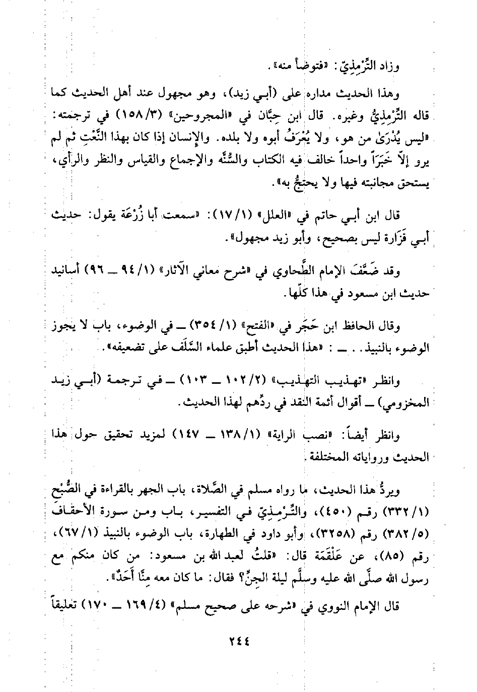 وقال الحافظ ابن حَجَر في "الفتح" (١/ ٣٥٤) -في الوضوء، باب لا يجوز الوضوء بالنبيذ. .-: "هذا الحديث أطبق علماء السَّلَف على تضعيفه".