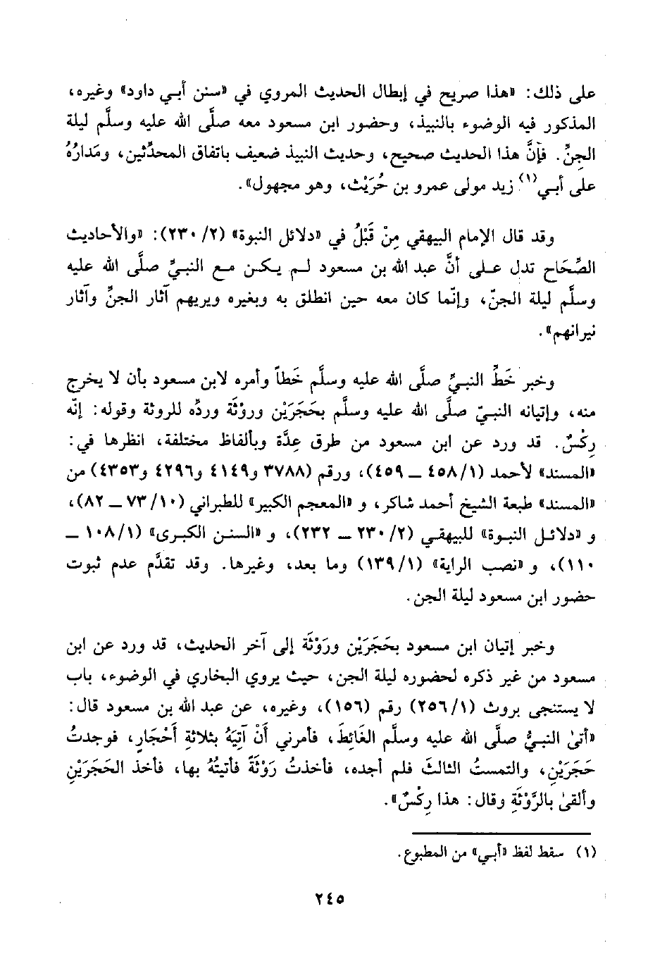 وخبر خَطِّ النبيِّ صلَّى اللَّه عليه وسلَّم خَطًا وأمره لابن مسعود بأن لا يخرج منه، وإتيانه النبيّ صلَّى اللَّه عليه وسلَّم بحَجَرَيْن وروْثَة وردِّه للروثة وقوله: إنَّه رِكْسٌ. قد ورد عن ابن مسعود من طرق عِدَّة وبألفاظ مختلفة، انظرها في: "المسند" لأحمد (١/ ٤٥٨ - ٤٥٩)، ورقم (٣٧٨٨ و ٤١٤٩ و ٤٢٦٩ و ٤٣٥٣) من "المسند" طبعة الشيخ أحمد شاكر، و"المعجم الكبير" للطبراني (١٠/ ٧٣ - ٨٢)، و"دلائل النبوة" للبيهقي (٢/ ٢٣٠ - ٢٣٢)، و"السنن الكبرى" (١/ ١٠٨ - ١١٠)، و"نصب الراية" (١/ ١٣٩) وما بعد، وغيرها. وقد تقدَّم عدم ثبوت حضور ابن مسعود ليلة الجن.