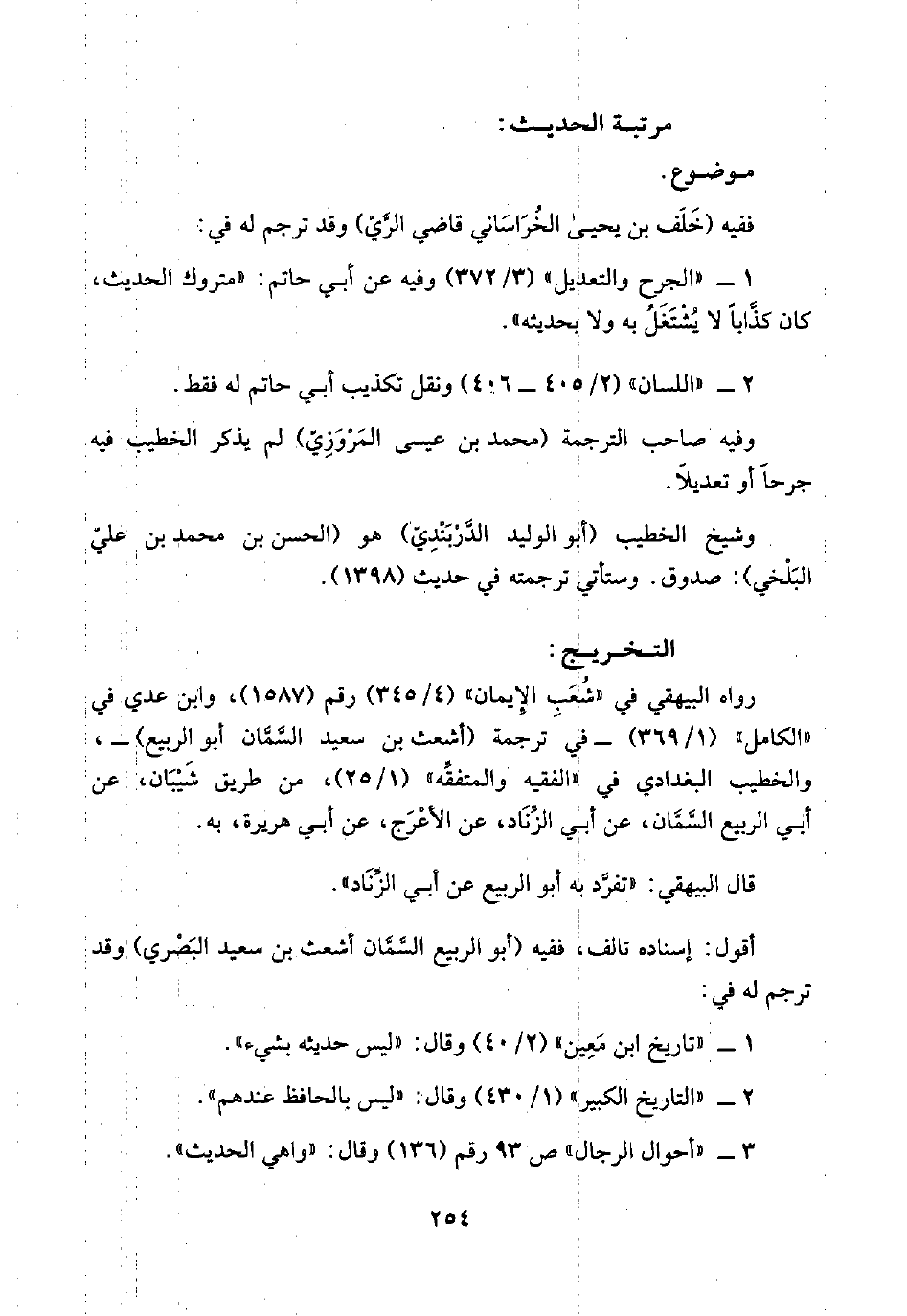 رواه البيهقي في "شُعَب الإيمان" (٤/ ٣٤٥) رقم (١٥٨٧)، وابن عدي في "الكامل" (١/ ٣٦٩) -في ترجمة (أشعث بن سعيد السَّمَّان أبو الربيع) -، والخطيب البغدادي في "الفقيه والمتفقِّه" (١/ ٢٥)، من طريق شَيْبَان، عن أبي الربيع السَّمَّان، عن أبي الزِّنَاد، عن الأَعْرَج، عن أبي هريرة، به.