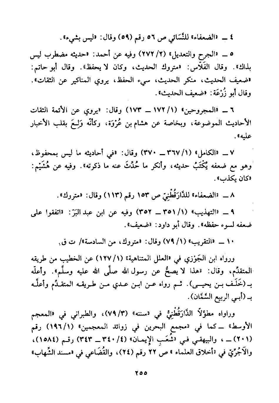 ٦ - "المجروحين" (١/ ١٧٢ - ١٧٣) وقال: "يروي عن الأئمة الثقات الأحاديث الموضوعة، وبخاصة عن هشام بن عُرْوَة، وكأنّه وَلِعَ بقلب الأخبار عليه".