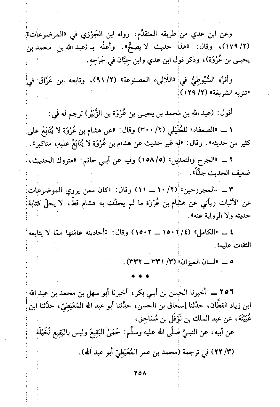 ٣ - "المجروحين" (٢/ ١٠ - ١١) وقال: "كان ممن يروي الموضوعات عن الأثبات ويأتي عن هشام بن عُرْوَة ما لم يحدِّث به هشام قطّ، لا يحلّ كتابة حديثه ولا الرواية عنه".