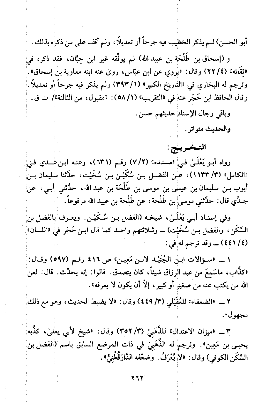 ٣ - "ميزان الاعتدال" للذَّهَبِيّ (٣/ ٣٥٢) وقال: "شيخ لأبي يعلى، كذَّبه يحيى بن مَعِين". وترجم له الذَّهَبِيّ في ذات الموضع السابق باسم (الفضل بن السَّكَن الكوفي) وقال: "لا يُعْرَفُ. وضعّفه الدَّارَقُطْنِيُّ".