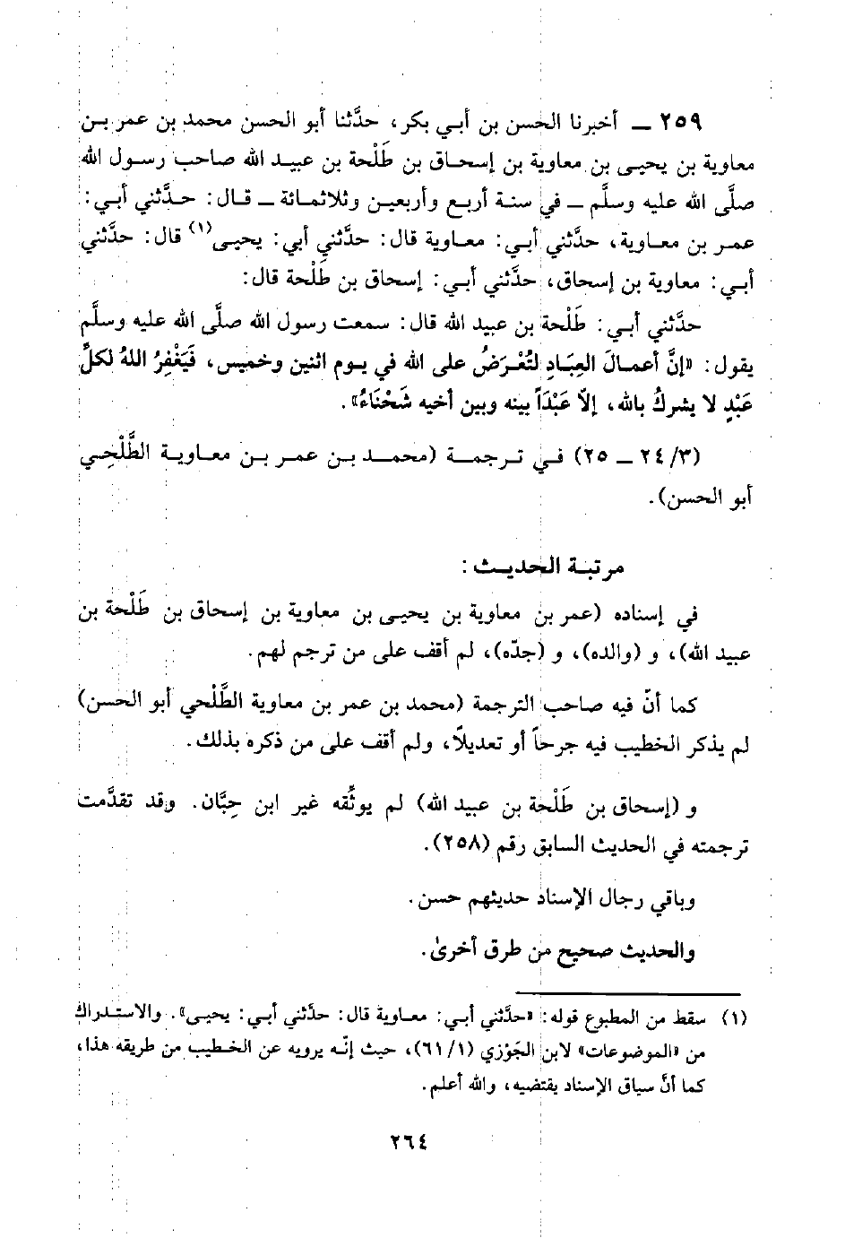 حدَّثني أبي: طَلْحة بن عبيد اللَّه قال: سمعت رسول اللَّه صلَّى اللَّه عليه وسلَّم يقول: "إنَّ أعمالَ العِبَادِ لتُعْرَضُ على اللَّه في يوم اثنين وخميس، فَيَغْفِرُ اللَّهُ لكلِّ عَبْدٍ لا يشركُ باللَّه، إلَّا عَبْدًا بينه وبين أخيه شَحْنَاءُ".