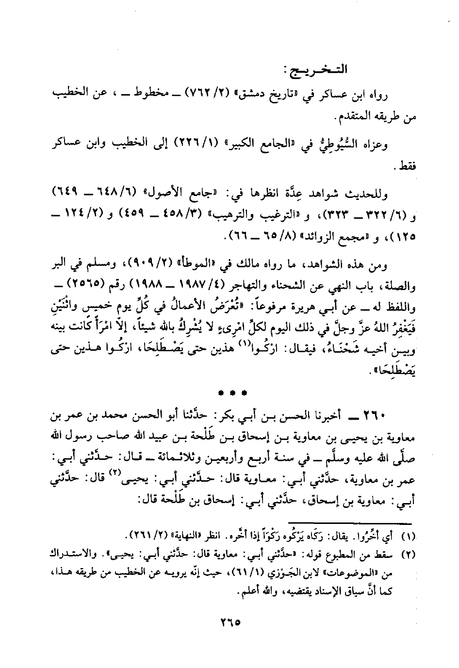 ومن هذه الشواهد، ما رواه مالك في "الموطأ" (٢/ ٩٠٩)، ومسلم في البر والصلة، باب النهي عن الشحناء والتهاجر (٤/ ١٩٨٧ - ١٩٨٨) رقم (٢٥٦٥) -واللفظ له- عن أبي هريرة مرفوعًا: "تُعْرَضُ الأعمال في كُلِّ يوم خميسٍ واثْنَيْنِ فَيَغْفِرُ اللَّهُ عزَّ وَجَلَّ في ذلك اليوم لكلِّ امْرئٍ لا يُشْرِكُ باللَّه شيئًا، إلَّا امْرأً كانت بينه وبين أخيه شَحْنَاءُ، فيقال: ارْكُوا (¬١) هذين حتى يَصْطَلِحَا، ارْكُوا هذين حتى يَصْطَلِحَا".