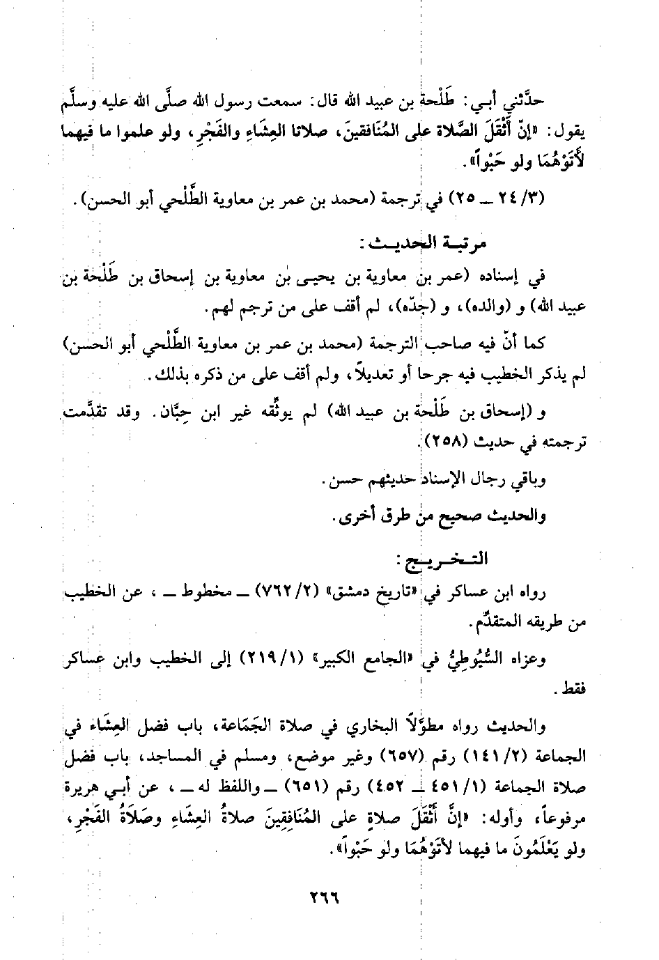 حدَّثني أبي: طَلْحة بن عبيد اللَّه قال: سمعت رسول اللَّه صلَّى اللَّه عليه وسلَّم يقول: "إنَّ أَثْقَلَ الصَّلاة على المُنَافقينَ، صلاتا العِشَاءِ والفَجْرِ، ولو علموا ما فيهما لأَتَوْهُمَا ولو حَبْوًا".