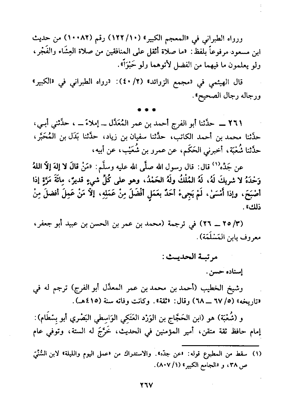 ٢٦١ - حدَّثنا أبو الفرج أحمد بن عمر المُعَدَّل -إملاءً-، حدَّثني أبي، حدَّثنا محمد بن أحمد الكاتب، حدَّثنا سفيان بن زياد، حدَّثنا بَدَل بن المُحَبَّر، حدَّثنا شُعْبَة، أخبرني الحَكَم، عن عمرو بن شُعَيْب، عن أبيه،