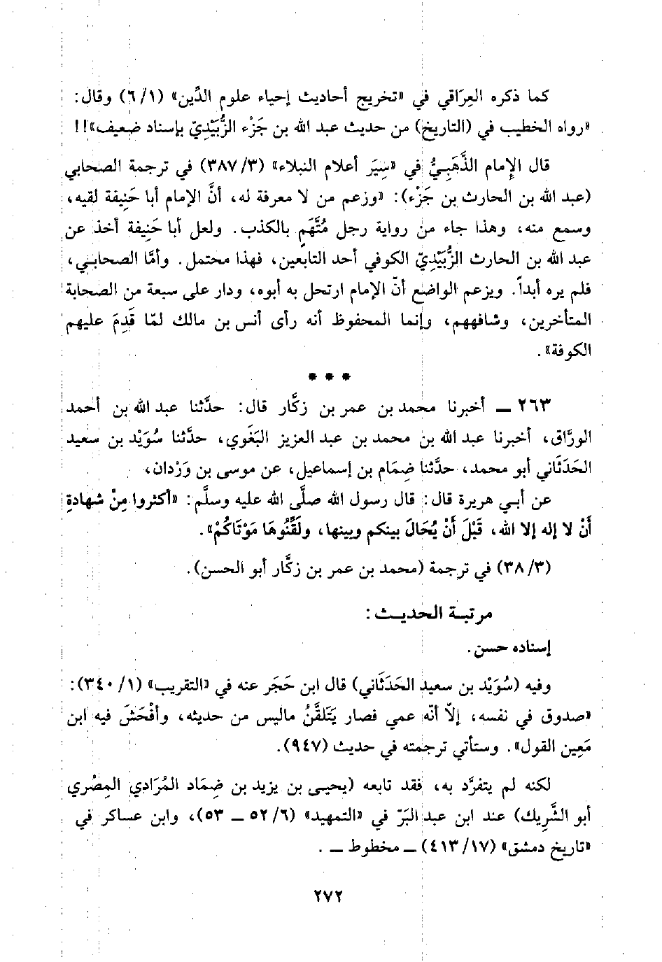 ٢٦٣ - أخبرنا محمد بن عمر بن زكَّار قال: حدَّثنا عبد اللَّه بن أحمد الورَّاق، أخبرنا عبد اللَّه بن محمد بن عبد العزيز البَغَوي، حدَّثنا سُوَيْد بن سعيد الحَدَثَاني أبو محمد، حدَّثنا ضِمَام بن إسماعيل، عن موسى بن وَرْدان،