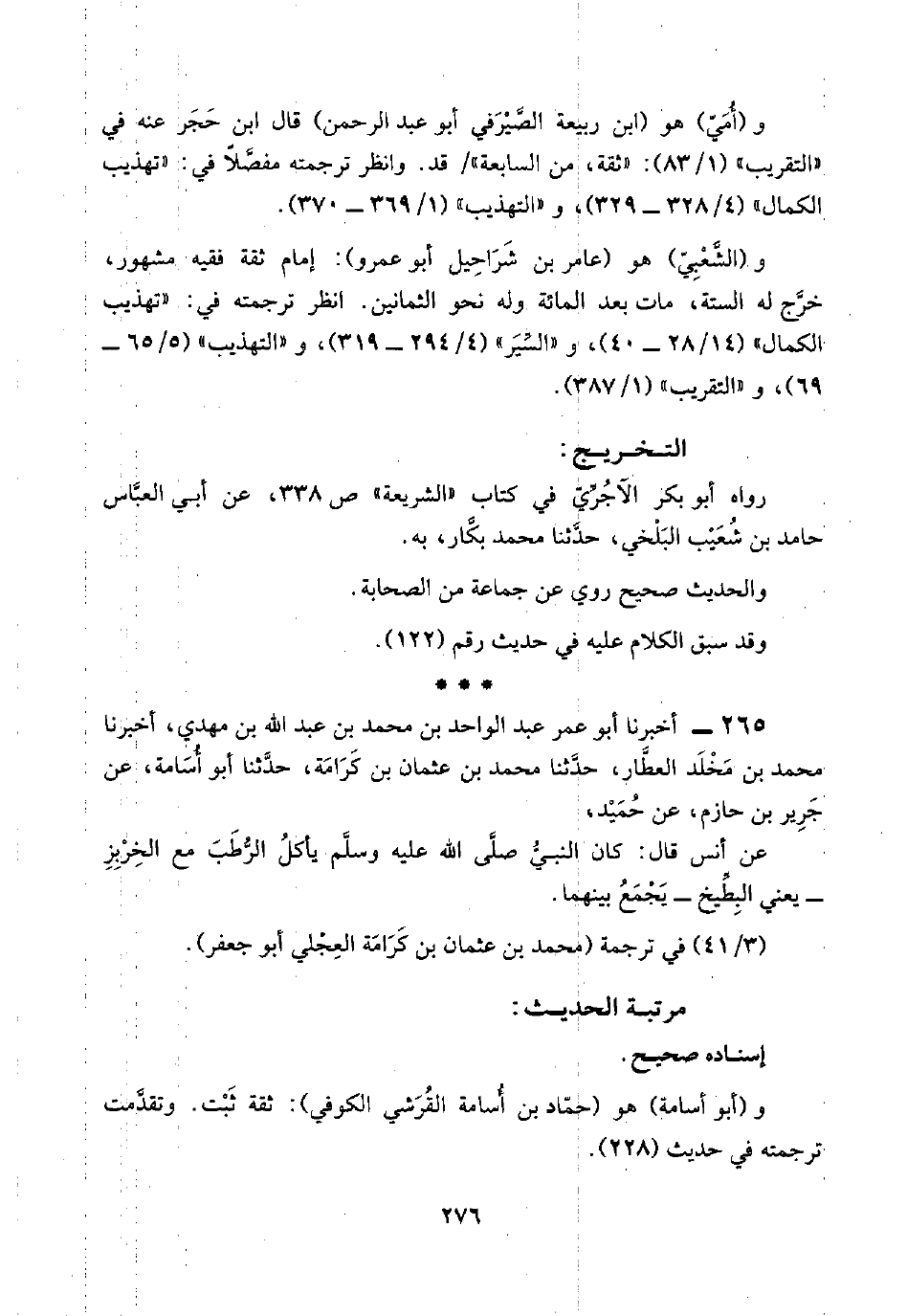 رواه أبو بكر الآجُرِّيّ في كتاب "الشريعة" ص ٣٣٨، عن أبي العبَّاس حامد بن شُعَيْب البَلْخي، حدَّثنا محمد بكَّار، به.