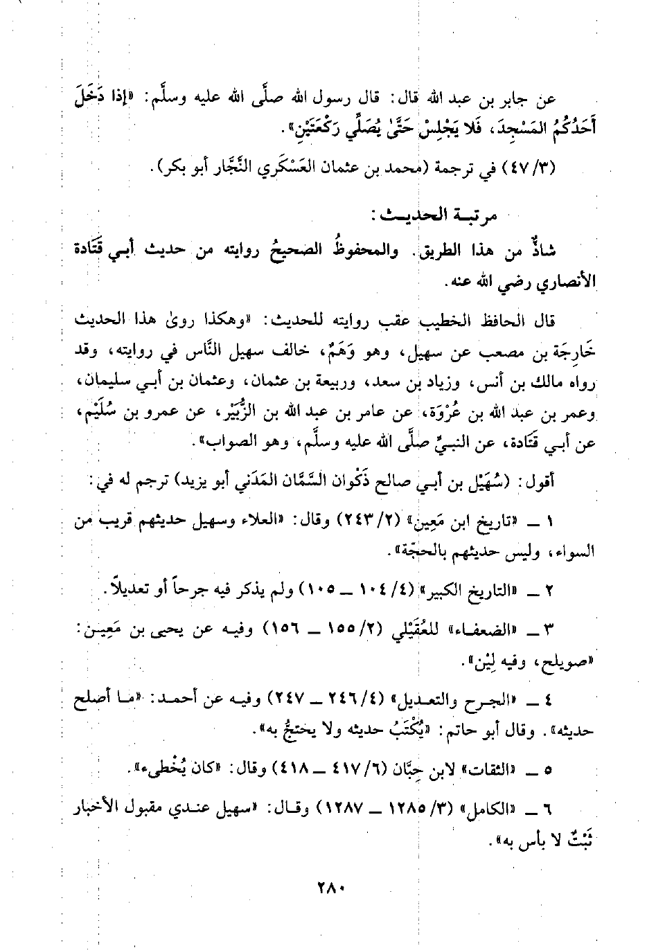 ١ - "تاريخ ابن مَعِين" (٢/ ٢٤٣) وقال: "العلاء وسهيل حديثهم قريب من السواء، وليس حديثهم بالحجّة".