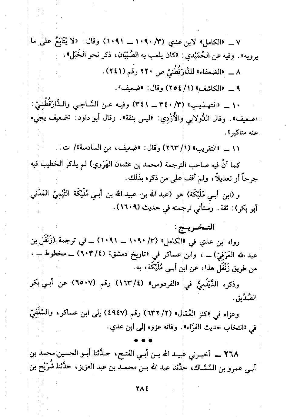 ٧ - "الكامل" لابن عدي (٣/ ١٠٩٠ - ١٠٩١) وقال: "لا يُتَابَعُ على ما يرويه". وفيه عن الحُمَيْدي: "كان يلعب به الصِّبْيَان، ذكر نحو الخَبَل".