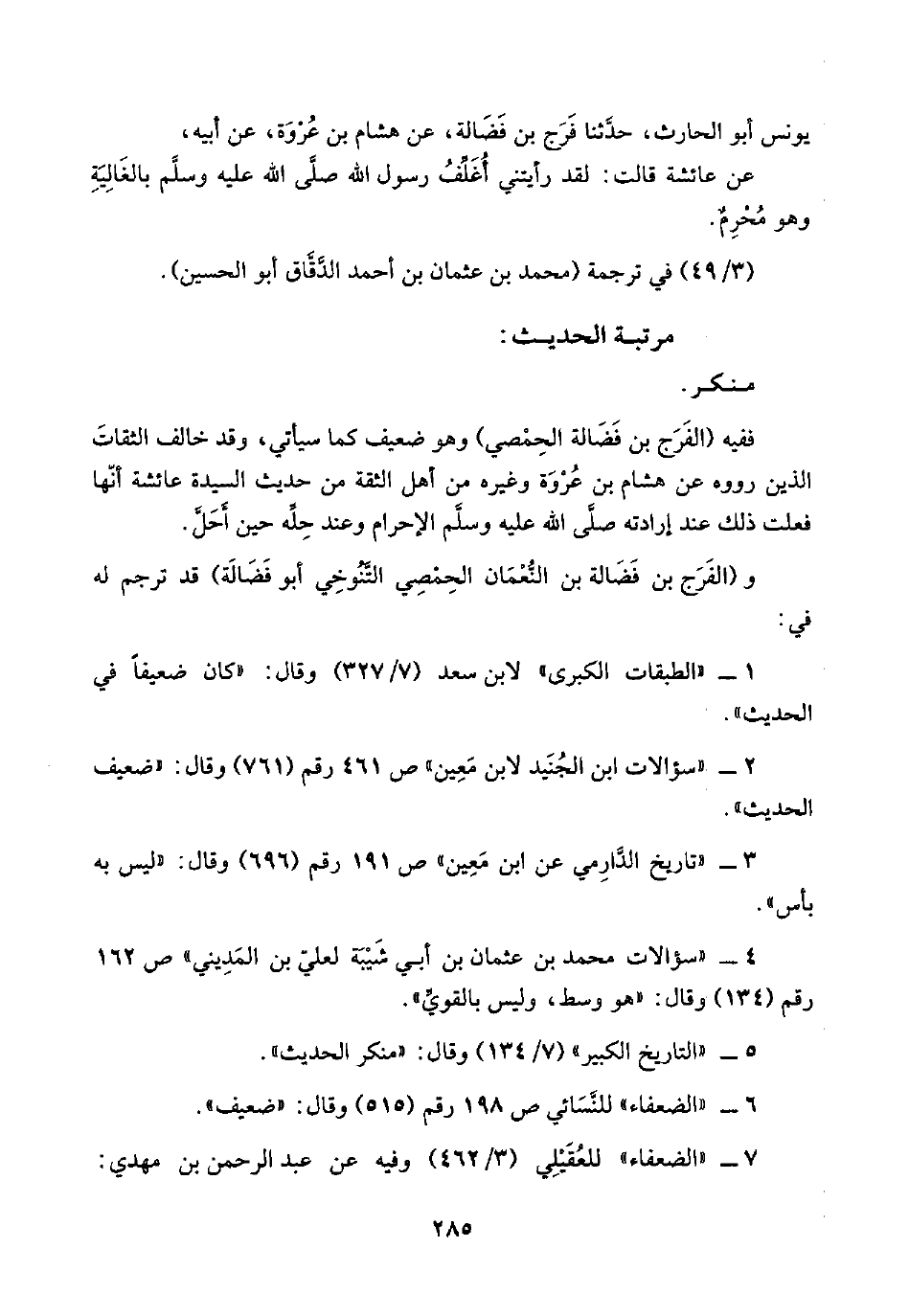 ٦ - "الضعفاء" للنَّسَائي ص ١٩٨ رقم (٥١٥) وقال: "ضعيف".