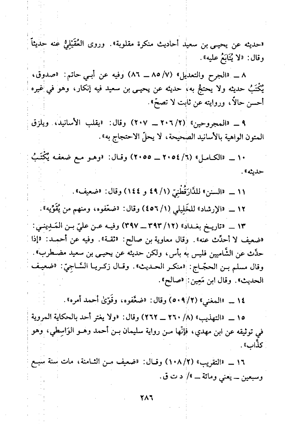 ١٥ - "التهذيب" (٨/ ٢٦٠ - ٢٦٢) وقال: "ولا يغتر أحد بالحكاية المروية في توثيقه عن ابن مهدي، فإنَّها من رواية سليمان بن أحمد وهو الوَاسِطي، وهو كذَّاب".