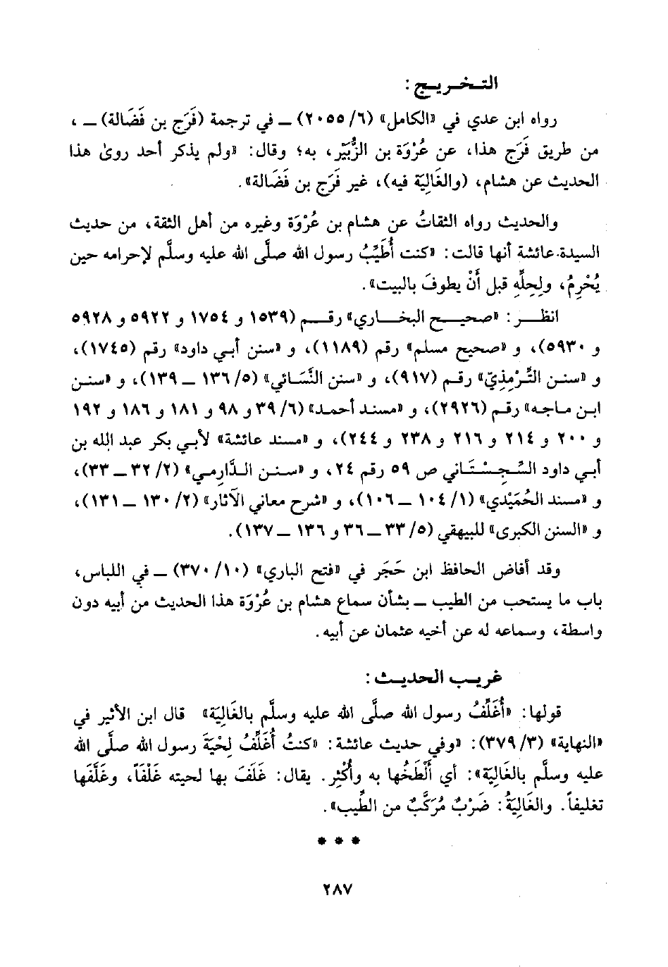 وقد أفاض الحافظ ابن حَجَر في "فتح الباري" (١٠/ ٣٧٠) -في اللباس، باب ما يستحب من الطيب- بشأن سماع هشام بن عُرْوَة هذا الحديث من أبيه دون واسطة، وسماعه له عن أخيه عثمان عن أبيه.
