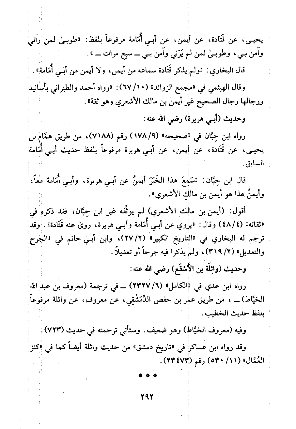 أقول: (أيمن بن مالك الأشعري) لم يوثِّقه غير ابن حِبَّان، فقد ذكره في "ثقاته" (٤/ ٤٨) وقال: "يروي عن أبي أُمَامة وأبي هريرة، روى عنه قَتَادة". وقد ترجم له البخاري في "التاريخ الكبير" (٢/ ٢٧)، وابن أبي حاتم في "الجرح والتعديل" (٢/ ٣١٩)، ولم يذكرا فيه جرحًا أو تعديلًا.