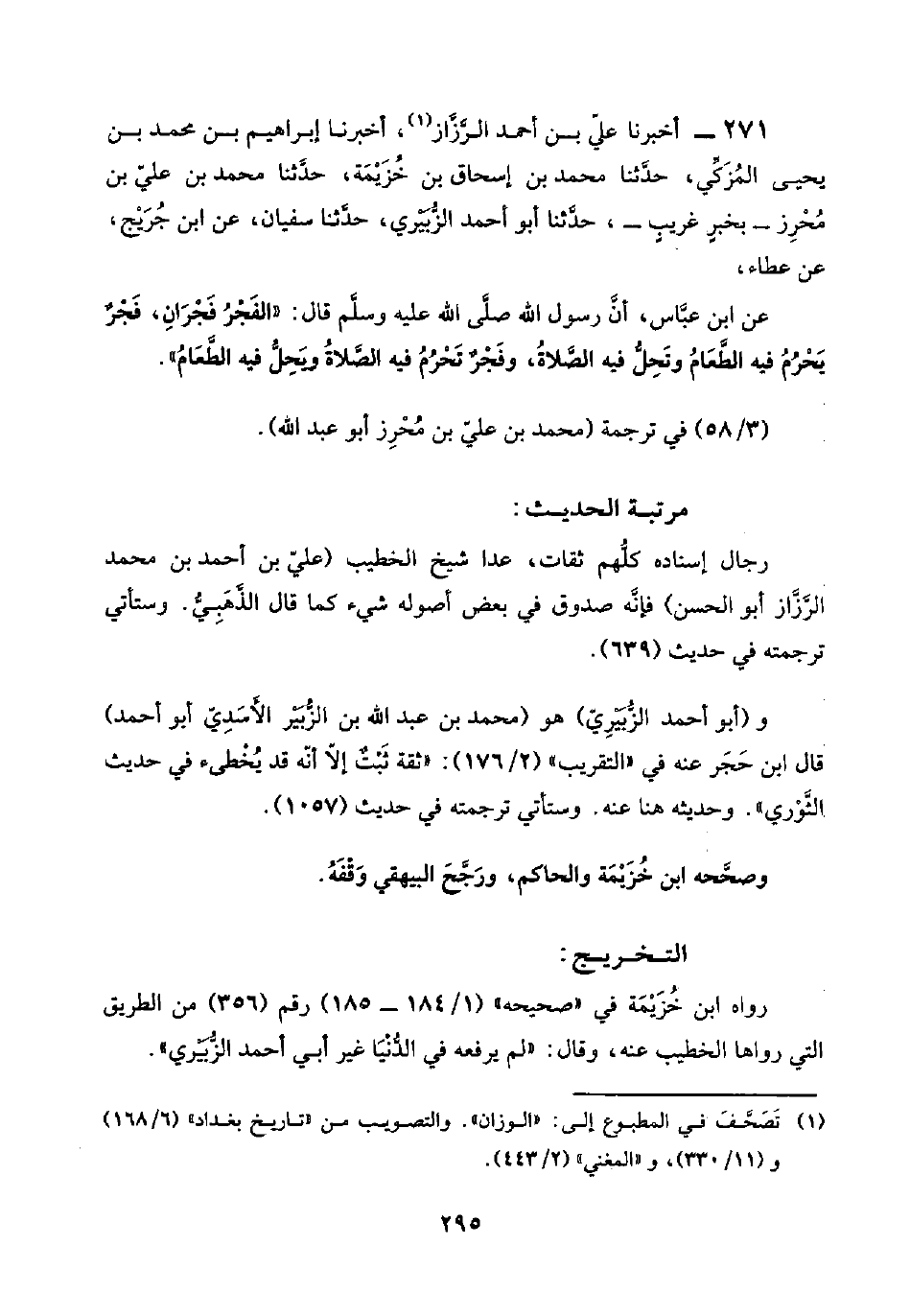 ٢٧١ - أخبرنا عليّ بن أحمد الرَّزَّاز (¬١)، أخبرنا إبراهيم بن محمد بن يحيى المُزَكِّي، حدَّثنا محمد بن إسحاق بن خُزَيْمَة، حدَّثنا محمد بن عليّ بن مُحْرِز -بخبرٍ غريبٍ-، حدَّثنا أبو أحمد الزُّبَيْري، حدَّثنا سفيان، عن ابن جُرَيْج، عن عطاء،