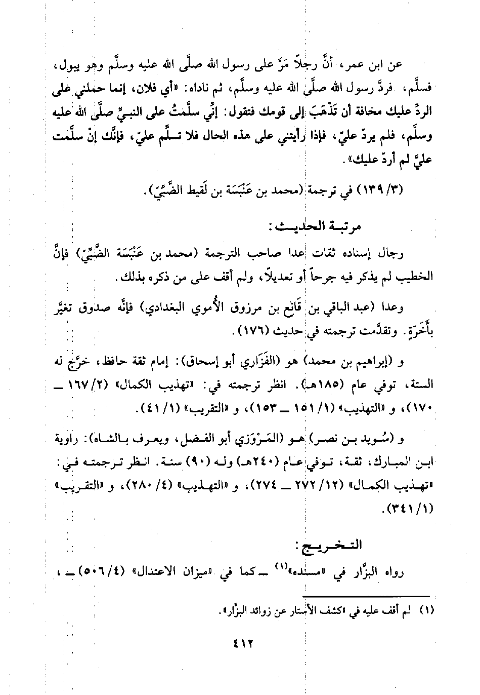 عن ابن عمر، أنَّ رجلًا مَرَّ على رسول اللَّه صلَّى اللَّه عليه وسلَّم وهو يبول، فسلَّم، فردَّ رسول اللَّه صلَّى اللَّه عليه وسلَّم، ثم ناداه: "أي فلان، إنما حملني على الردِّ عليك مخافة أن تَذْهَبَ إلى قومك فتقول: إنِّي سلَّمتُ على النبيِّ صلَّى اللَّه عليه وسلَّم، فلم يردّ عليّ، فإذا رأيتني على هذه الحال فلا تسلِّم عليّ، فإنَّك إنْ سلَّمت عليَّ لم أردّ عليك".