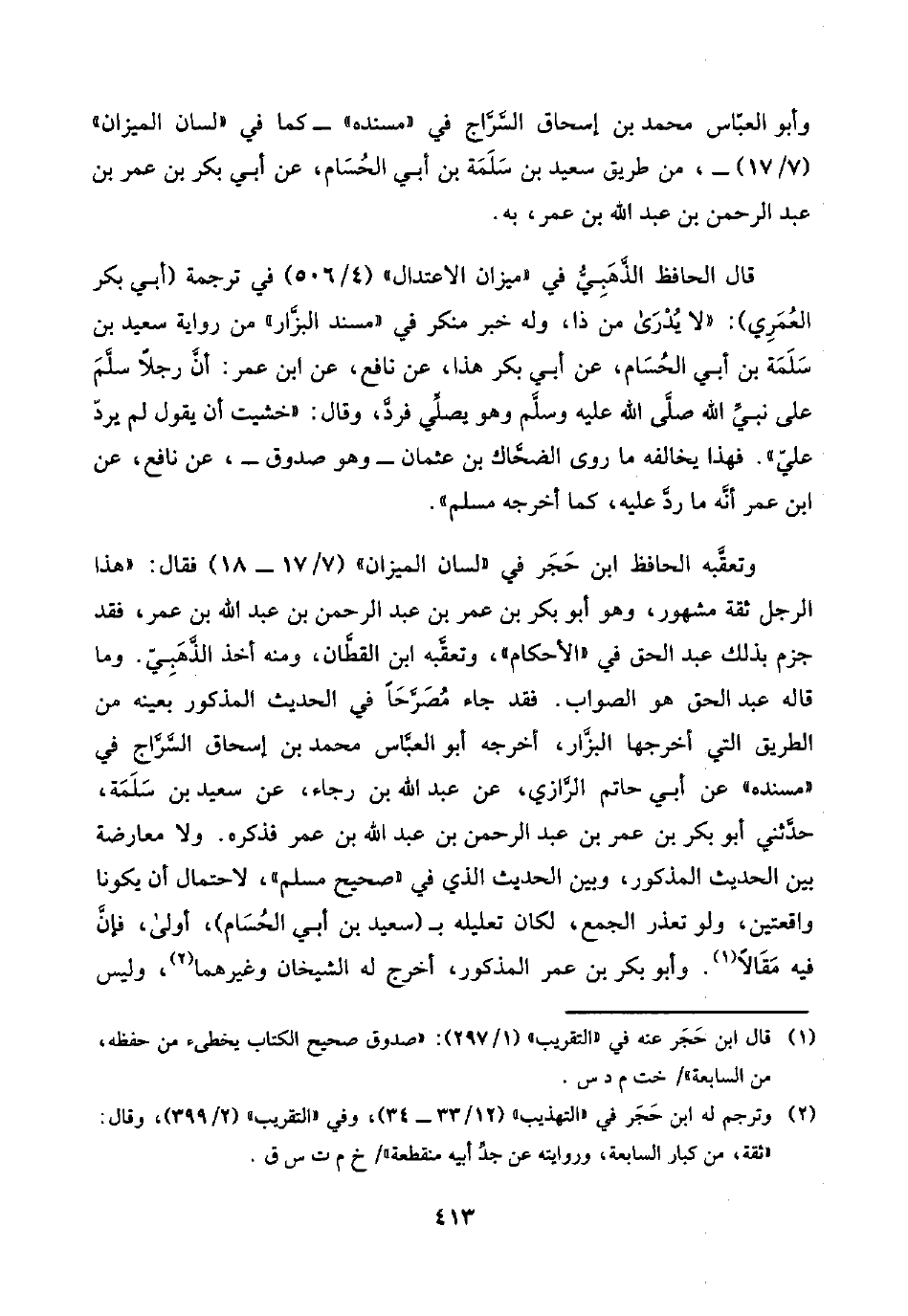 وتعقَّبه الحافظ ابن حَجَر في "لسان الميزان" (٧/ ١٧ - ١٨) فقال: "هذا الرجل ثقة مشهور، وهو أبو بكر بن عمر بن عبد الرحمن بن عبد اللَّه بن عمر، فقد جزم بذلك عبد الحق في "الأحكام"، وتعقَّبه ابن القَطَّان، ومنه أخذ الذَّهَبِيّ. وما قاله عبد الحق هو الصواب. فقد جاء مُصَرَّحًا في الحديث المذكور بعينه من الطريق التي أخرجها البزَّار، أخرجه أبو العبَّاس محمد بن إسحاق السَّرَّاج في "مسنده" عن أبي حاتم الرَّازي، عن عبد اللَّه بن رجاء، عن سعيد بن سَلَمَة، حدَّثني أبو بكر بن عمر بن عبد الرحمن بن عبد اللَّه بن عمر فذكره. ولا معارضة بين الحديث المذكور، وبين الحديث الذي في "صحيح مسلم"، لاحتمال أن يكونا واقعتين، ولو تعذر الجمع، لكان تعليله بـ (سعيد بن أبي الحُسَام)، أولى، فإنَّ فيه مَقَالًا (¬١). وأبو بكر بن عمر المذكور، أخرج له الشيخان وغيرهما (¬٢)، وليس