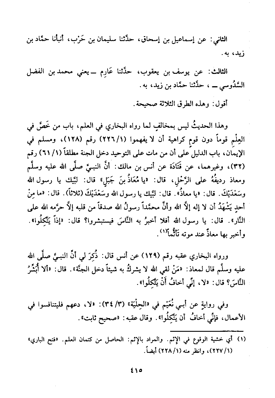 ورواه البخاري عقبه رقم (١٢٩) عن أنس قال: ذُكِرَ لي أنَّ النبيَّ صلَّى اللَّه عليه وسلَّم قال لمعاذ: "مَنْ لقي اللَّه لا يشركُ به شيئًا دخل الجنَّة". قال: "ألا أُبَشِّرُ النَّاسَ؟ قال: "لا، إنِّي أخافُ أَنْ يَتَّكِلُوا".