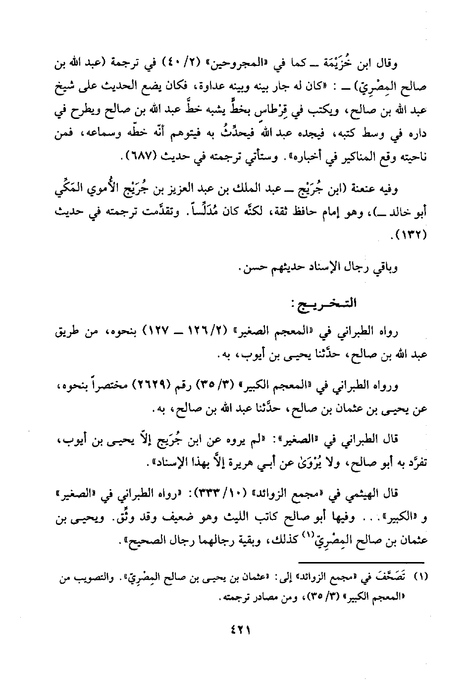 قال الهيثمي في "مجمع الزوائد" (١٠/ ٣٣٣): رواه الطبراني في "الصغير" و"الكبير". . . . وفيها أبو صالح كاتب الليث وهو ضعيف وقد وثِّق. ويحيى بن عثمان بن صالح المِصْرِيّ (¬١) كذلك، وبقية رجالهما رجال الصحيح".