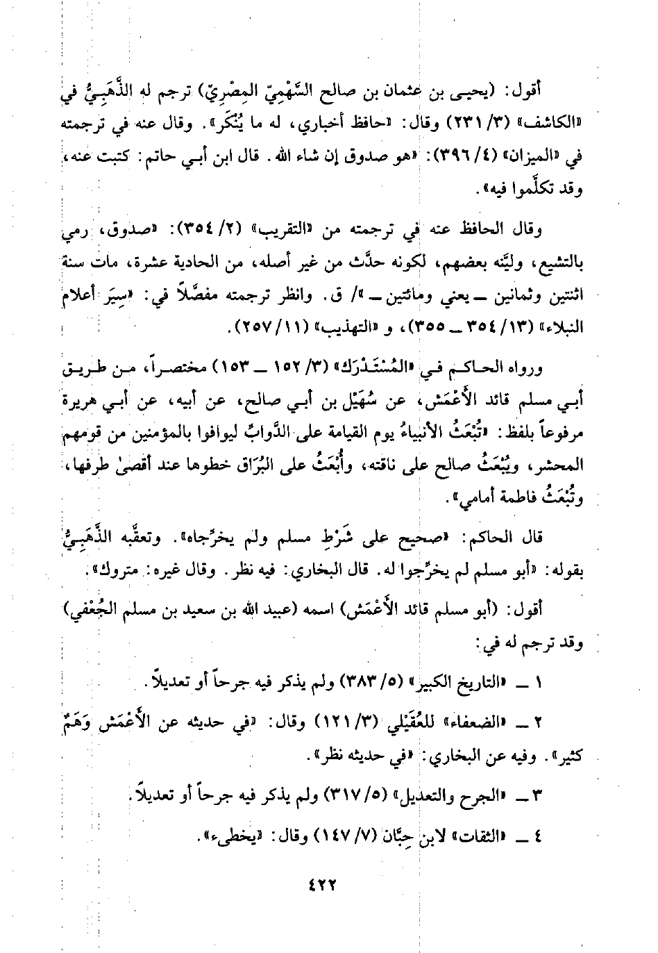 ورواه الحاكم في "المُسْتَدْرَك" (٣/ ١٥٢ - ١٥٣) مختصرًا، من طريق أبي مسلم قائد الأَعْمَش، عن سُهَيْل بن أبي صالح، عن أبيه، عن أبي هريرة مرفوعًا بلفظ: "تُبْعَثُ الأنبياءُ يوم القيامة على الدَّوابِّ ليوافوا بالمؤمنين من قومهم المحشر، ويُبْعَثُ صالح على ناقته، وأُبْعَثُ على البُرَاق خطوها عند أقصى طرفها، وتُبْعَثُ فاطمة أمامي".