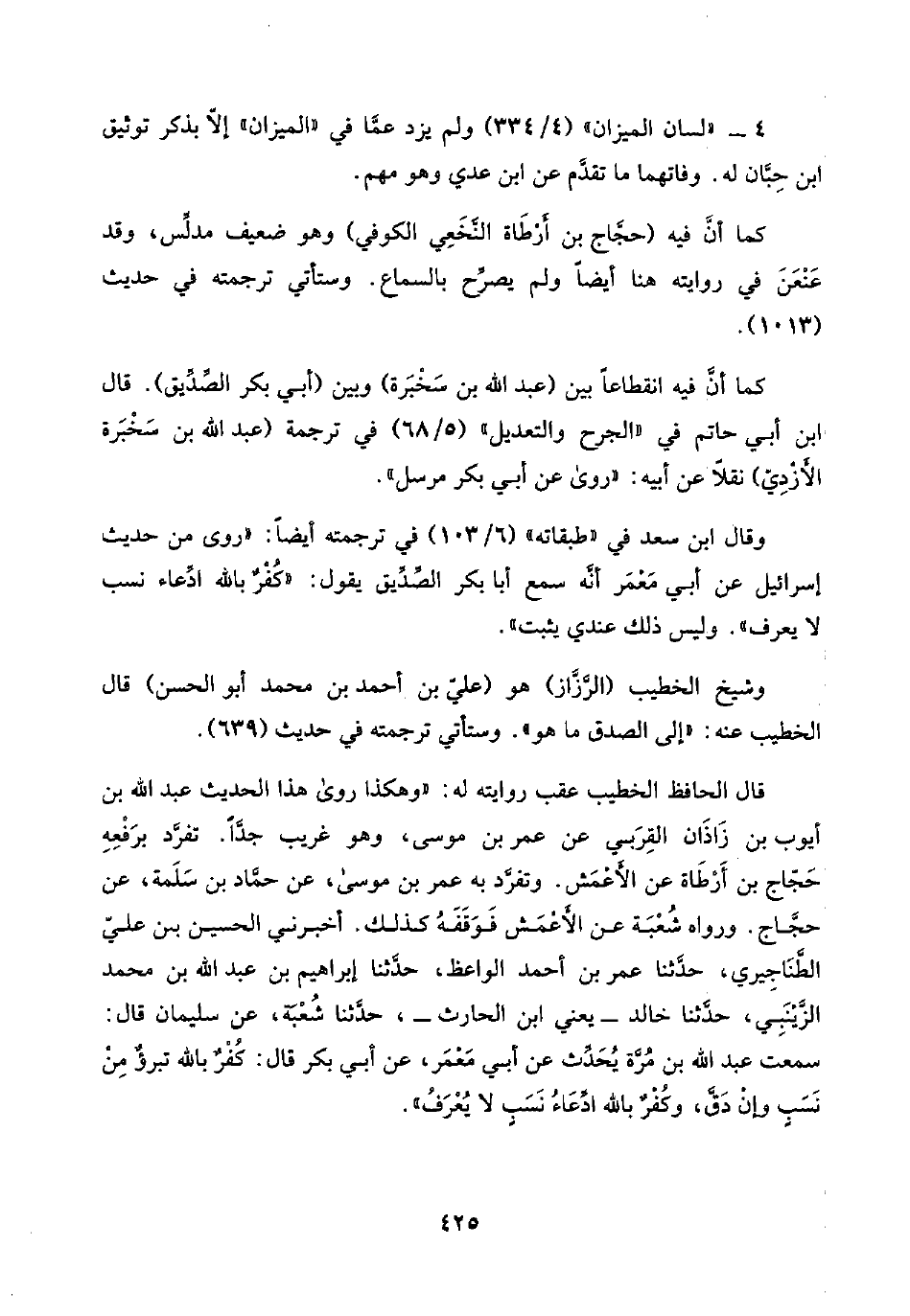 قال الحافظ الخطيب عقب روايته له: "وهكذا روى هذا الحديث عبد اللَّه بن أيوب بن زَاذَان القِرَبي عن عمر بن موسى، وهو غريب جدًّا. تفرَّد برَفْعِهِ حجَّاج بن أَرْطَاة عن الأَعْمَش. وتفرَّد به عمر بن موسى، عن حمَّاد بن سَلَمة، عن حجَّاج. ورواه شُعْبَة عن الأَعْمَش فَوَقَفَهُ كذلك. أخبرني الحسين بن عليّ الطَّنَاجِيري، حدَّثنا عمر بن أحمد الواعظ، حدَّثنا إبراهيم بن عبد اللَّه بن محمد الزَّيْنَبِي، حدَّثنا خالد -يعني ابن الحارث-، حدَّثنا شُعْبَة، عن سليمان قال: سمعت عبد اللَّه بن مُرَّة يُحَدِّث عن أبي مَعْمَر، عن أبي بكر قال: كُفْرٌ باللَّه تبروٌ مِنَ نَسَبٍ وإنْ دَقَّ، وكُفْرٌ باللَّه ادِّعَاءُ نَسَبٍ لا يُعْرَفُ".