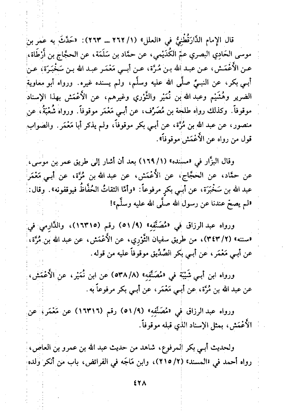 قال الإمام الدَّارَقُطنِيُّ في "العلل" (١/ ٢٦٢ - ٢٦٣): "حَدَّثَ به عمر بن موسى الحَادِي البَصْري عمّ الكُدَيْمي، عن حمَّاد بن سَلَمَة، عن الحجَّاج بن أَرْطَاة، عن الأَعْمَش، عن عبد اللَّه بن مُرَّة، عن أبي مَعْمَر عبد اللَّه بن سَخْبَرَة، عن أبي بكر، عن النبيِّ صلَّى اللَّه عليه وسلَّم، ولم يسنده غيره. ورواه أبو معاوية الضرير وهُشَيْم وعبد اللَّه بن نُمَيْر والثَّوْري وغيرهم، عن الأَعْمَش بهذا الإسناد موقوفًا. وكذلك رواه طلحة بن مُصَرِّف، عن أبي مُعْمَر موقوفًا. ورواه شُعْبَهُ، عن منصور، عن عبد اللَّه بن مُرَّة، عن أبي بكر موقوفًا، ولم يذكر أبا مُعْمَر. والصواب قول من رواه عن الأَعْمَش موقوفًا".
