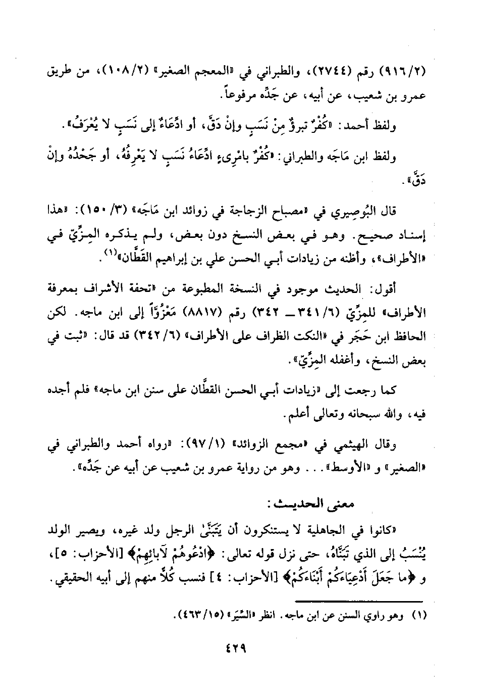 ولفظ ابن مَاجَه والطبراني: "كُفْرٌ بامْرِئٍ ادِّعَاءُ نَسَبٍ لا يَعْرِفُهُ، أو جَحْدُهُ وإنْ دَقَّ".