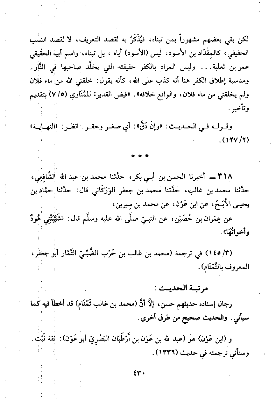 ٣١٨ - أخبرنا الحسن بن أبي بكر، حدَّثنا محمد بن عبد اللَّه الشَّافِعِي، حدَّثنا محمد بن غالب، حدَّثنا محمد بن جعفر الوَرَكَاني قال: حدَّثنا حمَّاد بن يحيى الأَبَحّ، عن ابن عَوْن، عن محمد بن سِيرين،