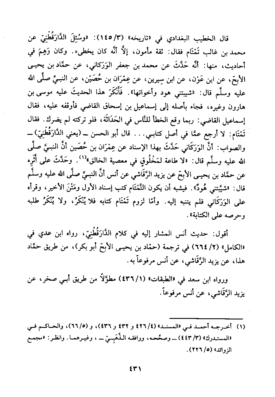 قال الخطيب البغدادي في "تاريخه" (٣/ ١٤٥): "وسُئِلَ الدَّارَقُطْنِيّ عن محمد بن غالب تَمْتَام فقال: ثقة مأمون، إلَّا أنَّه كان يخطئ. وكان وَهِمَ في أحاديث، منها: أنَّه حَدَّثَ عن محمد بن جعفر الوَرَكاني، عن حمَّاد بن يحيى الأبحّ، عن ابن عَوْن، عن ابن سِيرين، عن عِمْرَان بن حُصَيْن، عن النبيِّ صلَّى اللَّه عليه وسلَّم قال: "شيبتني هود وأخواتها". فَأَنْكَرَ هذا الحديثَ عليه موسى بن هارون وغيره، فجاء بأصله إلى إسماعيل بن إسحاق القاضي فأوقفه عليه، فقال إسماعيل القاضي: ربما وقع الخطا للنَّاس في الحَدَاثَة، فلو تركته لم يضرك. فقال تَمْتَام: لا أرجع عمَّا في أصل كتابي. . . قال أبو الحسن - (يعني الدَّارَقُطْنِيّ) - والصواب: أنَّ الوَرَكَاني حَدَّثَ بهذا الإسناد عن عِمْرَان بن حُصَين أنَّ النبيَّ صلَّى اللَّه عليه وسلَّم قال: "لا طاعة لمَخْلُوقٍ في معصية الخالق" (¬١). وحَدَّثَ على أَثَرِه عن حمَّاد بن يحيى الأبحّ عن يزيد الرَّقَاشي عن أنس أنَّ النبيَّ صلَّى اللَّه عليه وسلَّم قال: "شيَّبتني هُودٌ". فيشبه أن يكون التَّمْتَام كتب إسناد الأول ومَتْنَ الأخير، وقرأه على الوَرَكَاني فلم يتنبه إليه. وأمّا لزوم تَمْتَام كتابه فلا يُنْكَرُ، ولا يُنْكَرُ طلبه وحرصه على الكتابة".