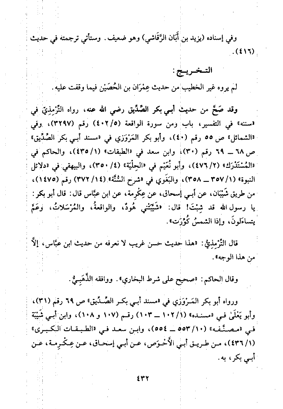 وقد صَحَّ من حديث أبي بكر الصِّدِّيق رضي اللَّه عنه، رواه التِّرمِذِيّ في "سننه" في التفسير، باب: ومن سورة الواقعة (٥/ ٤٠٢) رقم (٣٢٩٧)، وفي "الشمائل" ص ٥٥ رقم (٤٠)، وأبو بكر المَرْوَزي في "مسند أبي بكر الصِّدِّيق" ص ٦٨ - ٦٩ رقم (٣٠)، وابن سعد في "الطبقات" (١/ ٤٣٥)، والحاكم في "المُسْتَدْرَك" (٢/ ٤٧٦)، وأبو نُعَيْم في "الحِلْيَة" (٤/ ٣٥٠)، والبيهقي في "دلائل النبوة" (١/ ٣٥٧ - ٣٥٨)، والبَغَوي في "شرح السُّنَّة" (١٤/ ٣٧٢) رقم (١٤٧٥)، من طريق شَيْبَان، عن أبي إسحاق، عن عِكْرِمَة، عن ابن عبَّاس قال: قال أبو بكر: يا رسول اللَّه قد شِبْتَ! قال: "شَيَّبتْني هُودٌ، والواقعةُ، والمُرْسَلاتُ، وعَمَّ يتساءَلونَ، وإذا الشمسُ كُوِّرَت".