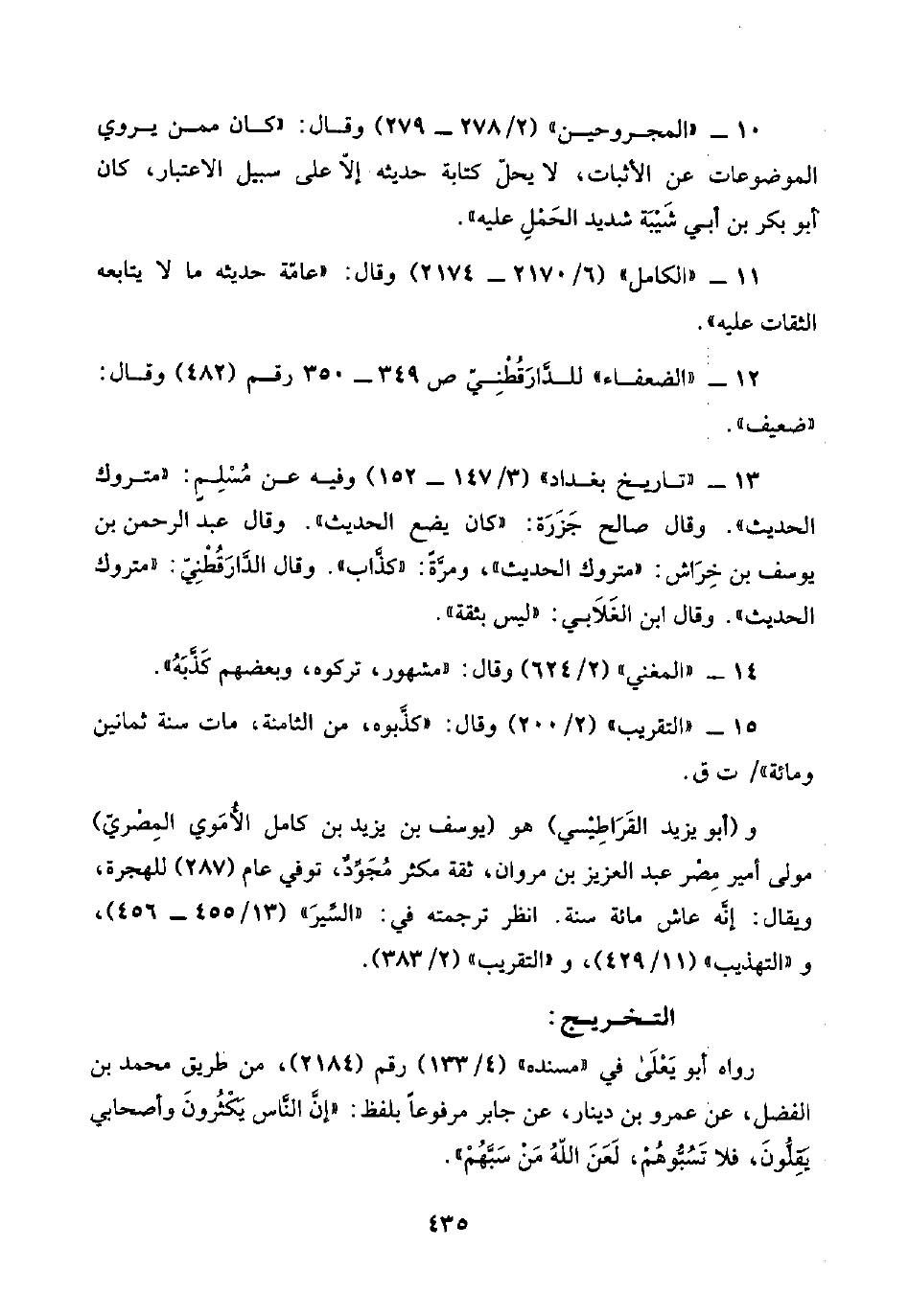 ١٢ - "الضعفاء" للدَّارَقُطْنِيّ ص ٣٤٩ - ٣٥٠ رقم (٤٨٢) وقال: "ضعيف".