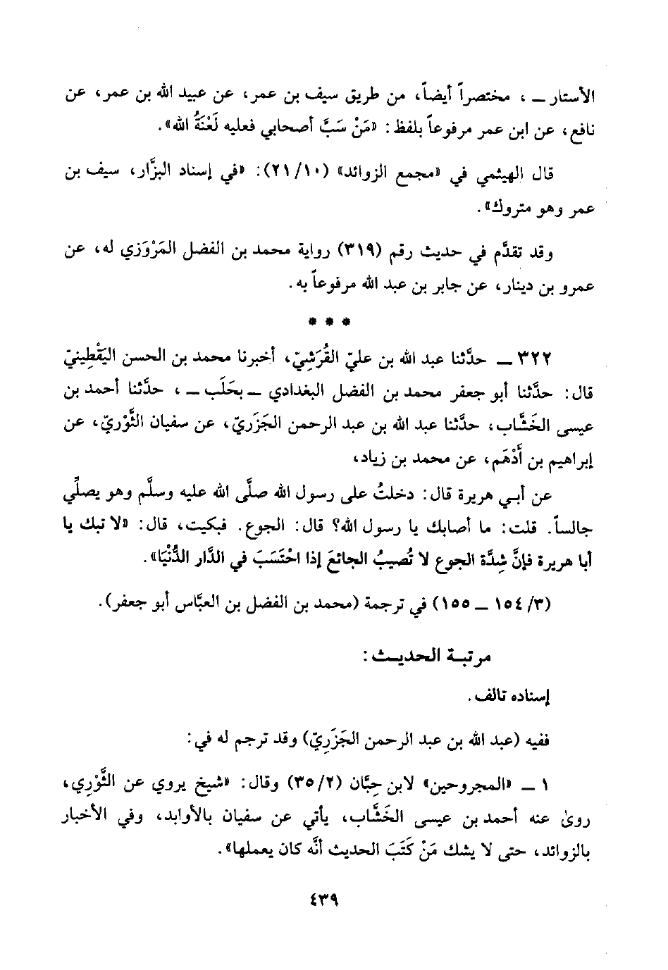 ٣٢٢ - حدَّثنا عبد اللَّه بن عليّ القُرَشِيّ، أخبرنا محمد بن الحسن اليَقْطِينيّ قال: حدَّثنا أبو جعفر محمد بن الفضل البغدادي -بحَلَب-، حدَّثنا أحمد بن عيسى الخَشَّاب، حدَّثنا عبد اللَّه بن عبد الرحمن الجَزَريّ، عن سفيان الثَّوْريّ، عن إبراهيم بن أَدْهَم، عن محمد بن زياد،
