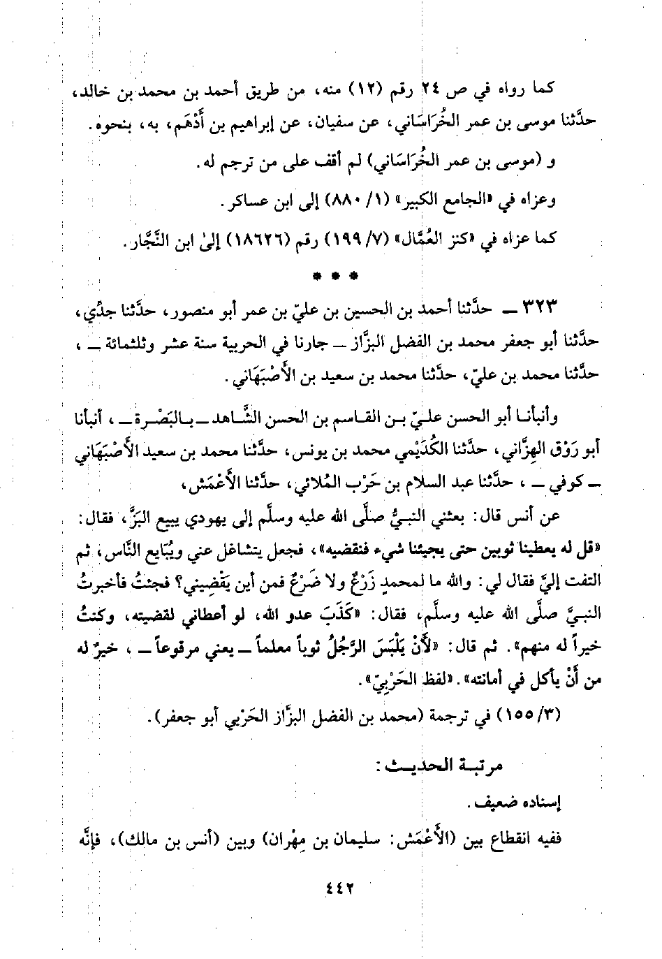 ٣٢٣ - حدَّثنا أحمد بن الحسين بن عليّ بن عمر أبو منصور، حدَّثنا جدِّي، حدَّثنا أبو جعفر محمد بن الفضل البزَّاز -جارنا في الحربية سنة عشر وثلثمائة-، حدَّثنا محمد بن عليّ، حدَّثنا محمد بن سعيد بن الأَصْبَهَاني.