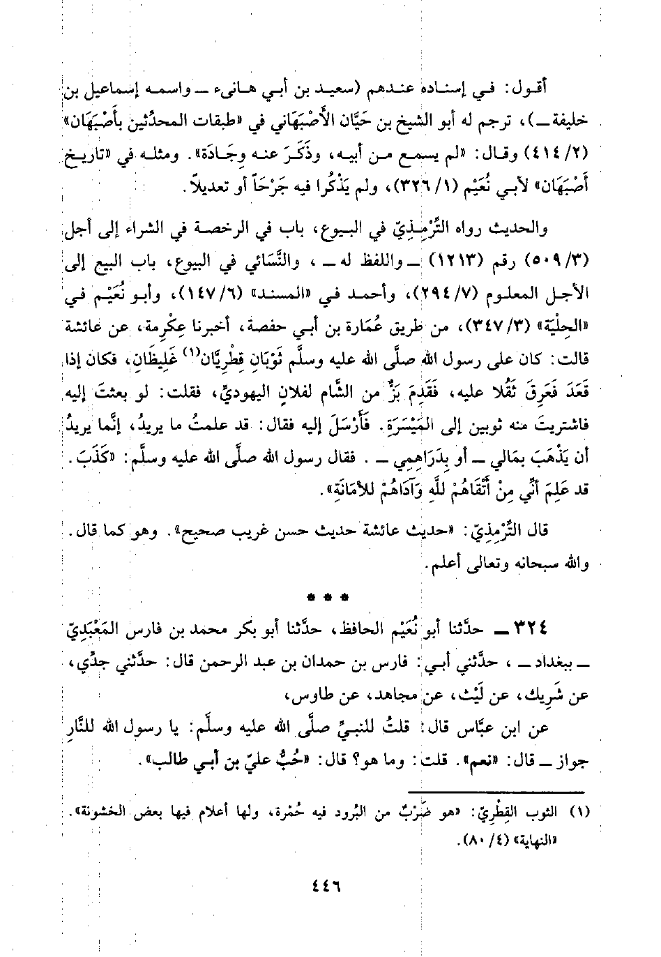 والحديث رواه التِّرْمِذِيّ في البيوع، باب في الرخصة في الشراء إلى أجل (٣/ ٥٠٩) رقم (١٢١٣) -واللفظ له-، والنَّسَائي في البيوع، باب البيع إلى الأجل المعلوم (٧/ ٢٩٤)، وأحمد في "المسند" (٦/ ١٤٧)، وأبو نُعَيْم في "الحِلْيَة" (٣/ ٣٤٧)، من طريق عُمَارة بن أبي حفصة، أخبرنا عِكْرِمة، عن عائشة قالت: كان على رسول اللَّه صلَّى اللَّه عليه وسلَّم ثَوْبَانِ قِطْرِيَّان (¬١) غَلِيظَانِ، فكان إذا قَعَدَ فَعَرِقَ ثَقُلا عليه، فَقَدِمَ بَزٌّ من الشَّام لفلانٍ اليهوديِّ، فقلت: لو بعثتَ إليه فاشتريتَ منه ثوبين إلى المَيْسَرَةِ. فَأَرْسَلَ إليه فقال: قد علمتُ ما يريدُ، إنَّما يريدُ أن يَذْهَبَ بمَالي -أو بدَرَاهِمِي-. فقال رسول اللَّه صلَّى اللَّه عليه وسلَّم: "كَذَبَ. قد عَلِمَ أنِّي مِنْ أَتْقَاهُمْ للَّه وَآدَاهُمْ للأمَانَةِ".
