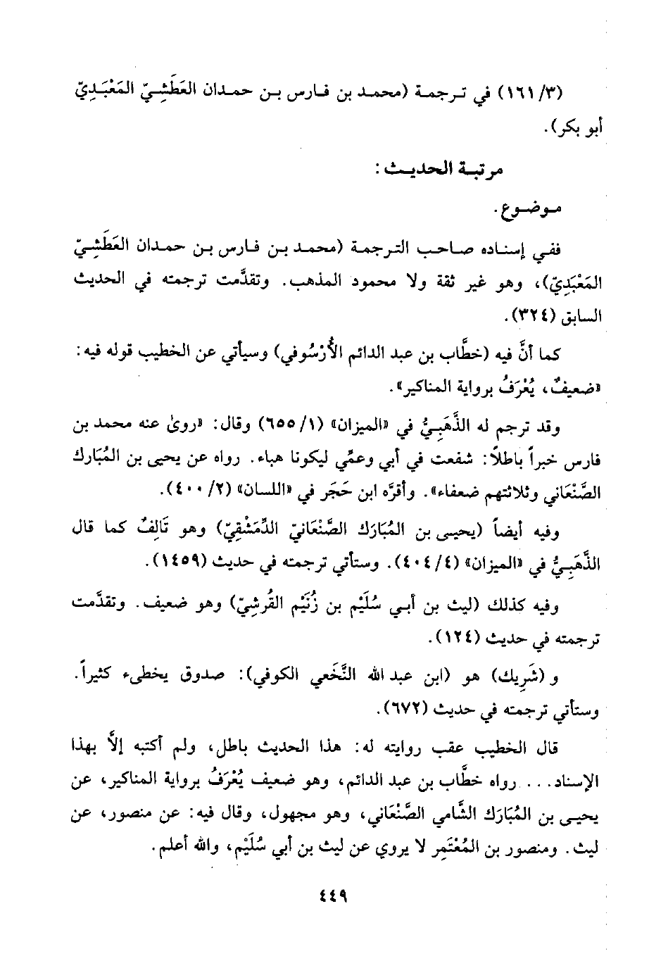 ففي إسناده صاحب الترجمة (محمد بن فارس بن حمدان العَطَشِيّ المَعْبَدِيّ)، وهو غير ثقة ولا محمود المذهب. وتقدَّمت ترجمته في الحديث السابق (٣٢٤).