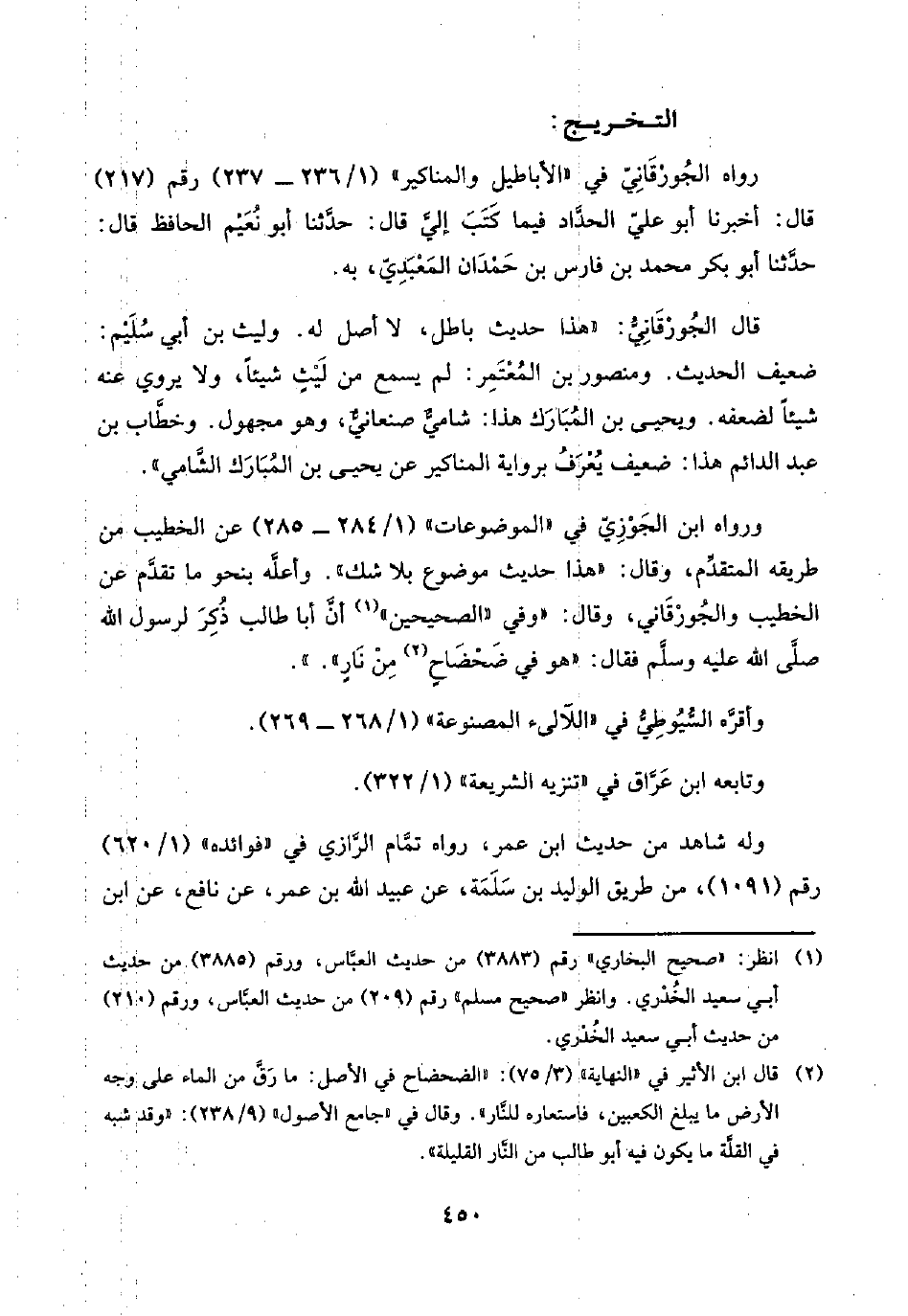 ورواه ابن الجَوْزِيّ في "الموضوعات" (١/ ٢٨٤ - ٢٨٥) عن الخطيب من طريقه المتقدِّم، وقال: "هذا حديث موضوع بلا شك". وأعلَّه بنحو ما تقدَّم عن الخطيب والجُورْقَاني، وقال: "وفي "الصحيحين" (¬١) أنَّ أبا طالب ذُكِرَ لرسول اللَّه صلَّى اللَّه عليه وسلَّم فقال: "هو في ضَحْضَاحٍ (¬٢) مِنْ نَارٍ".".