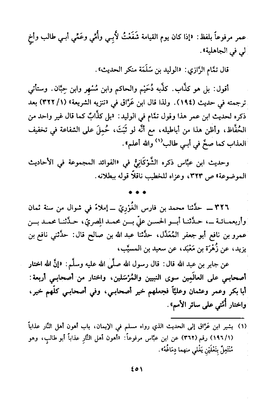 (¬١) يشير ابن عَرَّاق إلى الحديث الذي رواه مسلم في الإيمان، باب أهون أهل النَّار عذابًا (١/ ١٩٦) رقم (٣٦٢) عن ابن عبَّاس مرفوعًا: "أهون أهل النَّارِ عذابًا أبو طالبٍ، وهو مُنْتَعِلٌ بِنَعْلَيْنِ يَغْلي منهما دِمَاغُهُ".