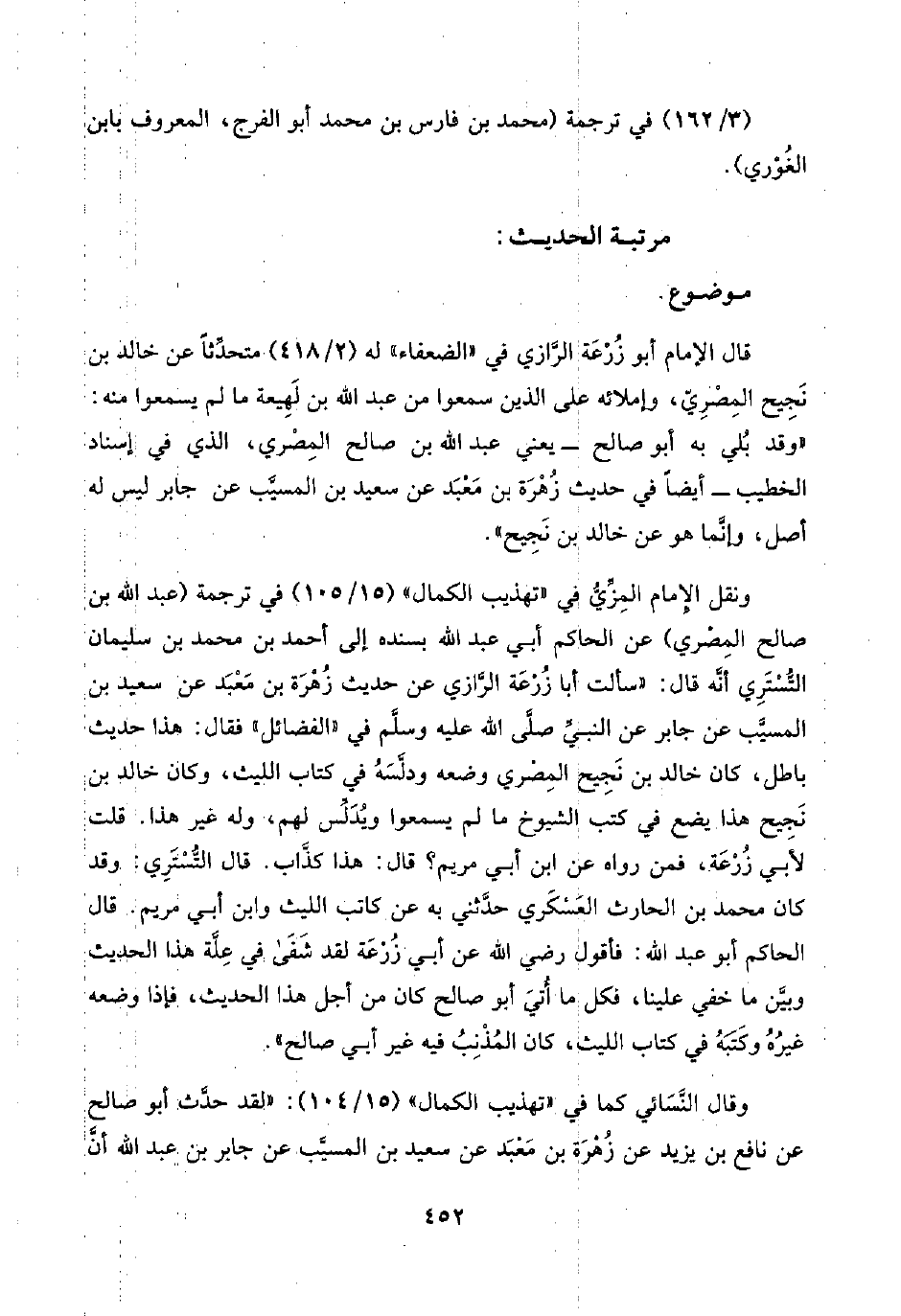 ونقل الإِمام المِزِّيُّ في "تهذيب الكمال" (١٥/ ١٠٥) في ترجمة (عبد اللَّه بن صالح المِصْري) عن الحاكم أبي عبد اللَّه بسنده إلى أحمد بن محمد بن سليمان التُّسْتَرِي أنَّه قال: "سألت أبا زُرْعَة الرَّازي عن حديث زُهْرَة بن مَعْبَد عن سعيد بن المسيَّب عن جابر عن النبيِّ صلَّى اللَّه عليه وسلَّم في "الفضائل" فقال: هذا حديث: باطل، كان خالد بن نَجِيح المِصْري وضعه ودلَّسَهُ في كتاب الليث، وكان خالد بن نَجِيح هذا يضع في كتب الشيوخ ما لم يسمعوا ويُدَلِّس لهم، وله غير هذا. قلت لأبي زُرْعَة، فمن رواه عن ابن أبي مريم؟ قال: هذا كذَّاب. قال التُّسْتَرِي: وقد كان محمد بن الحارث العَسْكَري حدَّثني به عن كاتب الليث وابن أبي مريم. قال الحاكم أبو عبد اللَّه: فأقول رضي اللَّه عن أبي زُرْعَة لقد شَفَى في عِلَّة هذا الحديث وبيَّن ما خفي علينا، فكل ما أُتيَ أبو صالح كان من أجل هذا الحديث، فإذا وضعه غيرُهُ وكَتَبَهُ في كتاب الليث، كان المُذْنِبُ فيه غير أبي صالح".