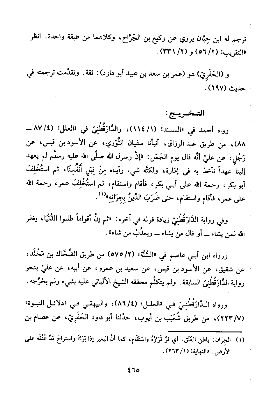 رواه أحمد في "المسند" (١/ ١١٤)، والدَّارَقُطْنِيّ في "العلل" (٤/ ٨٧ - ٨٨)، من طريق عبد الرزاق، أنبأنا سفيان الثَّوْري، عن الأسود بن قيس، عن رَجُلٍ، عن عليّ أنَّه قال يوم الجَمَل: "إنَّ رسول اللَّه صلَّى اللَّه عليه وسلَّم لم يعهد إلينا عهدًا نأخذ به في إمَارة، ولكنَّه شيء رأيناه مِنْ قِبَلِ أَنْفُسِنَا، ثم استُخْلِفَ أبو بكر، رحمة اللَّه على أبي بكر، فأقام واستقام، ثم استُخْلِفَ عمر، رحمة اللَّه على عمر، فأقام واستقام، حتى ضَرَبَ الدِّينُ بِجِرَانِهِ" (¬١).